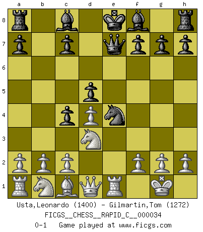 Last move : 0-1 2007 July 20 17:52:55 [Event "FICGS__CHESS__RAPID_C__000034"] [Site "FICGS"] [Date "2007.06.06"] [Round "1"] [White "Usta,Leonardo"] [Black "Gilmartin,Tom"] [Result "0-1"] [WhiteElo "1400"] [BlackElo "1272"] 1.e4 e5 2.Nf3 Nc6 3.Bb5 Nf6 4.Bxc6 bxc6 5.Nxe5 Qe7 6.d4 Nxe4 7.O-O c5 8.Re1 d5 9.Nd3 c4 0-1 This chess game has been lost on time (started : 2007.06.06 18:2:29) Ruy Lopez : Berlin defense Kingside Castling by player White (move 7) Player Black won this chess game. Follow this game move after move (download)Chess is ruthless: you've got to be prepared to kill people. (Nigel Short) Wenn du nicht weißt was du tun sollst, warte bis dein Gegner eine Idee hat. Sie wird sicher schlecht sein. (Siegbert Tarrasch) El Ajedrez es un invernadero donde los frutos del carácter pueden madurar mas completamente que en la vida. (Edward Morgan Foster) Les échecs sont un jeu terrible. Si vous n'avez pas le centre, votre adversaire a une position plus libre. Par contre, si vous avez le centre, alors vous avez vraiment quelque chose pour laquelle vous inquiéter ! (Siegbert Tarrasch) There are two types of people in this world, good and bad. The good sleep better, but the bad seem to enjoy the waking hours much more. (Woody Allen)