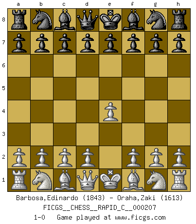 Last move : 1-0 2019 May 1 7:12:26 [Event "FICGS__CHESS__RAPID_C__000207"] [Site "FICGS"] [Date "2019.03.31"] [Round "1"] [White "Barbosa,Edinardo"] [Black "Oraha,Zaki"] [Result "1-0"] [WhiteElo "1843"] [BlackElo "1613"] 1.e4 1-0 This chess game has been lost on time (started : 2019.03.31 22:52:6) King's pawn Opening Player White won this chess game. Follow this game move after move (download)Openings teach you openings. Endgames teach you chess ! (Stephan Gerzadowicz) Schach ist die gewalttätigste aller Sportarten. (Garry Kasparov) Si el Ajedrez es una ciencia, es la mas inexacta. Si el Ajedrez es un arte, es demasiado inexacto para ser visto como tal. Si el Ajedrez es un deporte, es demasiado esotérico. Si el Ajedrez es un juego, es demasiado exigente para ser solo un juego. Si el Ajedrez es una aventura, es una muy demandante. Si el Ajedrez es una pasión, es una muy gratificante. Si el Ajedrez es la vida, es una muy triste. (Anónimo) Fischer est le meilleur joueur du monde et Karpov n'est qu'un joueur de bistrot. (Garry Kasparov, agé de 16 ans) You lose, general Kenobi. (General Grievous in Star Wars ep.3)