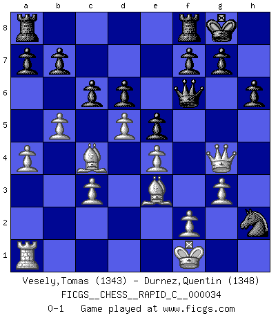 Last move : 0-1 2007 July 14 15:40:32 [Event "FICGS__CHESS__RAPID_C__000034"] [Site "FICGS"] [Date "2007.06.06"] [Round "1"] [White "Vesely,Tomas"] [Black "Durnez,Quentin"] [Result "0-1"] [WhiteElo "1343"] [BlackElo "1348"] 1.e4 e5 2.Nf3 Nc6 3.Bc4 Bc5 4.d3 h6 5.a3 d6 6.Nc3 Nf6 7.Nd5 Be6 8.b4 Bd4 9.Nxd4 Nxd4 10.Bb2 c6 11.Nxf6+ Qxf6 12.O-O Qg6 13.c3 Bh3 14.g3 Bxf1 15.Kxf1 Ne6 16.a4 O-O 17.b5 Ng5 18.Bc1 Nh3 19.Be3 Qf6 20.Qg4 Ng5 21.d4 Nf3 22.d5 Nxh2+ 0-1 Giuoco Pianissimo Kingside Castling by player White (move 12) Kingside Castling by player Black (move 16) Player Black won this chess game. Follow this game move after move (download)By playing at Chess then, we may learn: First: Foresight... Second: Circumspection... Third: Caution... And lastly, we learn by Chess the habit of not being discouraged by present bad appearances in the state of our affairs, the habit of hoping for a favorable chance, and that of persevering in the secrets of resources. (Benjamin Franklin) Charakterschwächen offenbaren sich normalerweise während einer Schachpartie. (Garry Kasparov) Cuando tu casa esta en llamas, no puedes ser molestado por tus vecinos. O, como decinos en Ajedrez, si tu Rey esta bajo ataque, no te preocupa perder un Peón del lado de la Reina. (Gary Kasparov) Mon pion favori sur ma case favorite ! Bronstein en parlant d'un coup de pion en h5 quand il avait les Noirs. You can think I'm wrong, but that's no reason to quit thinking. (Gregory House, House M.D.)