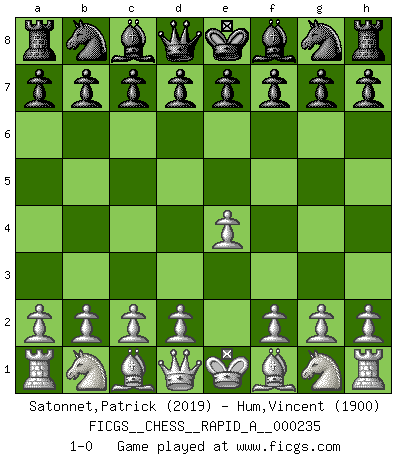 Last move : 1-0 2019 May 2 7:12:52 [Event "FICGS__CHESS__RAPID_A__000235"] [Site "FICGS"] [Date "2019.04.01"] [Round "1"] [White "Satonnet,Patrick"] [Black "Hum,Vincent"] [Result "1-0"] [WhiteElo "2019"] [BlackElo "1900"] 1.e4 1-0 This chess game has been lost on time (started : 2019.04.01 0:24:3) King's pawn Opening Player White won this chess game. Follow this game move after move (download)By this measure (on the gap between Fischer & his contemporaries), I consider him the greatest world champion. (Garry Kasparov) Das Blackmar-Diemer-Gambit verändert den ganzen Menschen! (Emil Joseph Diemer) A la fecha, Fischer esta simplemente un nivel arriba de todos los mejores jugadores de Ajedrez del mundo. (John Jacobs) Toute estimation doit être constamment réévaluée. (Jacob Estrin) Question: Is 'This statement is paradoxical' a paradoxical statement ? Or is it a meta-paradox ? (Normajean Yates)
