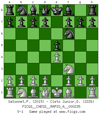 Last move : 0-1 2019 May 8 7:33:22 [Event "FICGS__CHESS__RAPID_A__000235"] [Site "FICGS"] [Date "2019.04.01"] [Round "1"] [White "Satonnet,Patrick"] [Black "Cleto Junior,Dirceu"] [Result "0-1"] [WhiteElo "2019"] [BlackElo "2226"] 1.e4 e5 2.Nf3 Nf6 0-1 This chess game has been lost on time (started : 2019.04.01 0:24:3) Petrov's defense Player Black won this chess game. Follow this game move after move (download)Your body has to be in top condition. Your Chess deteriorates as your body does. You can't separate body from mind. (Bobby Fischer) Ich verachte die Medien. (Robert James Fischer) El jugador de combinación piensa hacia adelante; comienza de la posición dada y trabaja las movidas contundentes en su mente. (Emanuel Lasker) Vous savez, camarade Pachman, je n'éprouve pas de plaisir à être ministre, je jouerais plutôt aux échecs comme vous, ou alors ferais une révolution au Venezuela. (Che Guevara à Ludek Pachman, 'Checkmate in Prague', 1975) The difference between perseverance and obstinacy is that one comes from a strong will, and the other from a strong won't. (Henry Ward Beecher)