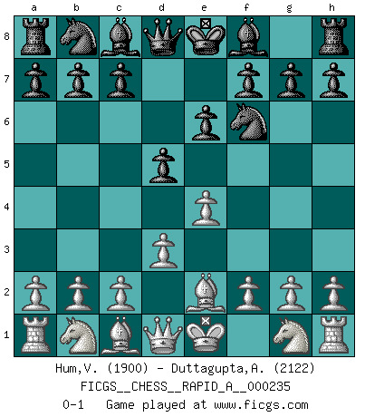 Last move : 0-1 2019 May 4 7:17:3 [Event "FICGS__CHESS__RAPID_A__000235"] [Site "FICGS"] [Date "2019.04.01"] [Round "1"] [White "Hum,Vincent"] [Black "Duttagupta,Aniruddha"] [Result "0-1"] [WhiteElo "1900"] [BlackElo "2122"] 1.e4 e6 2.d3 d5 3.Be2 Nf6 0-1 This chess game has been lost on time (started : 2019.04.01 0:24:3) French : King's Indian attack Player Black won this chess game. Follow this game move after move (download)Who is your opponent tonight, tonight I am playing against the Black pieces. (Akiba Rubinstein) Unter Putin wird alles Geld aus Russland wie von einem Staubsauger nach Moskau umgeleitet, das ist wie ein schwarzes Loch. (Garry Kasparov) Cuando tengas duda... ¡juega al Ajedrez!. (Tevis) Avec des compensations pour le matériel en plus... (Anonyme) Control your own destiny or someone else will. (Jack Welch)