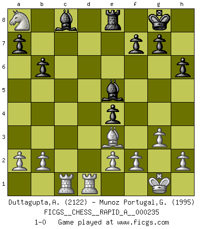 Last move : 1-0 2019 June 27 22:19:18 [Event "FICGS__CHESS__RAPID_A__000235"] [Site "FICGS"] [Date "2019.04.01"] [Round "1"] [White "Duttagupta,Aniruddha"] [Black "Munoz Portugal,Guillermo"] [Result "1-0"] [WhiteElo "2122"] [BlackElo "1995"] 1.d4 Nf6 2.c4 e6 3.g3 d5 4.Nf3 Be7 5.Bg2 O-O 6.O-O Nbd7 7.Qc2 c6 8.Nbd2 c5 9.cxd5 exd5 10.dxc5 Nxc5 11.Nb3 b6 12.Be3 Nce4 13.Rac1 h6 14.Nfd4 Qe8 15.Nc6 Bd6 16.Nd2 Bb7 17.Nxe4 Nxe4 18.Bxe4 dxe4 19.Rfd1 Qe6 20.Qc4 Rfe8 21.Qxe6 Rxe6 22.Nd4 R6e8 23.Nb5 Be5 24.Nc7 Bc8 25.Nxa8 1-0 Catalan Opening Kingside Castling by player Black (move 5) Kingside Castling by player White (move 6) Player White won this chess game. Follow this game move after move (download)A strong memory, concentration, imagination, and a strong will is required to become a great Chess player. (Bobby Fischer) Kostenjuk hat keinen Sexappeal. (Loek van Wely) Bobby Fischer es el jugador de Ajedrez mas grande que jamás haya existido. (Ken Smith) On peut tirer plus d'utilité d'une partie perdue que de 100 parties gagnées. (Capablanca) Establishing goals is all right if you don't let them deprive you of interesting detours. (Doug Larson)
