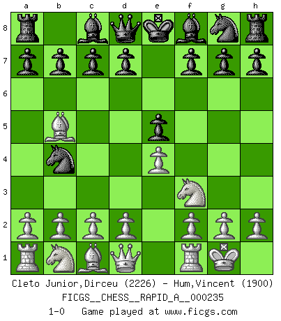 Last move : 1-0 2019 May 4 19:19:23 [Event "FICGS__CHESS__RAPID_A__000235"] [Site "FICGS"] [Date "2019.04.01"] [Round "1"] [White "Cleto Junior,Dirceu"] [Black "Hum,Vincent"] [Result "1-0"] [WhiteElo "2226"] [BlackElo "1900"] 1.e4 e5 2.Nf3 Nc6 3.Bb5 Nb4 4.O-O 1-0 This chess game has been lost on time (started : 2019.04.01 0:24:3) Ruy Lopez (Spanish Opening) Kingside Castling by player White (move 4) Player White won this chess game. Follow this game move after move (download)The King is a fighting piece. Use it ! (Wilhelm Steinitz) Schach ist die gewalttätigste aller Sportarten. (Garry Kasparov) El Ajedrez es un expediente tonto que hace creer a la gente inactiva que hacen una cosa muy astuta cuando solamente estan perdiendo su tiempo. (George Bernard Shaw) Seul un grand joueur sait à quel point il joue faiblement. (Xavier Tartacover) Hold em is to stud what chess is to checkers. (Johnny Moss)