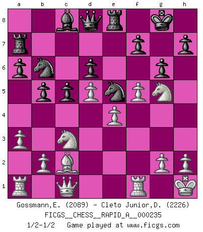 Last move : 1/2-1/2 2019 May 3 0:43:45 [Event "FICGS__CHESS__RAPID_A__000235"] [Site "FICGS"] [Date "2019.04.01"] [Round "1"] [White "Gossmann,Ewald"] [Black "Cleto Junior,Dirceu"] [Result "1/2-1/2"] [WhiteElo "2089"] [BlackElo "2226"] 1.d4 Nf6 2.c4 c5 3.d5 e6 4.Nc3 exd5 5.cxd5 d6 6.e4 g6 7.f4 Bg7 8.Bb5+ Nfd7 9.Nf3 a6 10.Bd3 b5 11.a3 O-O 12.O-O Re8 13.Kh1 Ra7 14.Bc2 Nb6 15.f5 N8d7 16.Bg5 Bf6 17.Qc1 Bxg5 18.Nxg5 Ne5 1/2-1/2 Benoni : pawn storm variation Kingside Castling by player Black (move 11) Kingside Castling by player White (move 12) This chess game ended in a draw. Follow this game move after move (download)In order to improve your game, you must study the endgame before everything else, for whereas the endings can be studied and mastered by themselves, the middle game and the opening must be studied in relation to the endgame. (Jose Raul Capablanca) Lisa Lane, amerikanische Schachmeisterin, hatte Fischer einmal als stärksten lebenden Spieler bezeichnet. Antwort: Das ist richtig, aber Lisa Lane ist eigentlich nicht in der Lage, das zu beurteilen. (Robert James Fischer) Repentinamente, me resultaba obvio en mi analisis que yo había pasado por alto lo que Fischer había visto en el tablero con la mas grande facilidad. (Mikhail Botvinnik) Psychologiquement, tu dois avoir confiance en toi même, mais cette confiance doit être basée sur des faits. (Robert Fischer) Only sick music makes money today. (Friedrich Nietzsche)
