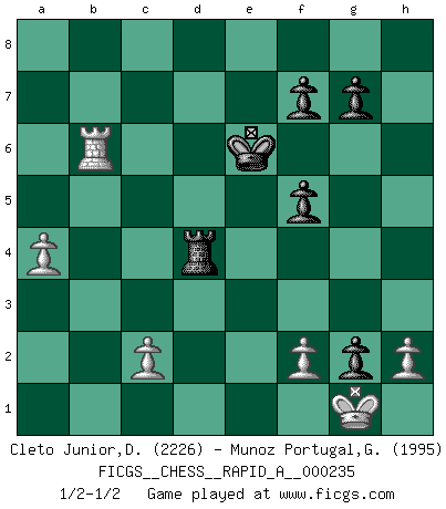 Last move : 1/2-1/2 2019 June 3 6:51:38 [Event "FICGS__CHESS__RAPID_A__000235"] [Site "FICGS"] [Date "2019.04.01"] [Round "1"] [White "Cleto Junior,Dirceu"] [Black "Munoz Portugal,Guillermo"] [Result "1/2-1/2"] [WhiteElo "2226"] [BlackElo "1995"] 1.e4 c6 2.d4 d5 3.e5 c5 4.dxc5 e6 5.a3 Bxc5 6.b4 Bb6 7.Qg4 Ne7 8.Nf3 Ng6 9.Bb2 Nc6 10.Bd3 h5 11.Qg3 h4 12.Qg4 Nce7 13.Nc3 Nf5 14.Ne2 a5 15.O-O Bd7 16.Rfb1 Nh6 17.Qh5 Nf5 18.Qg4 Nh6 19.Qh3 Nf5 20.bxa5 Rxa5 21.a4 Qc7 22.Qg4 h3 23.Bc3 Qc5 24.Rxb6 Qxb6 25.Bxa5 Qxa5 26.Rb1 d4 27.Nexd4 Nxe5 28.Nxe5 Rh4 29.Qd1 Rxd4 30.Nxd7 Qd5 31.Qf1 Kxd7 32.Rb5 Qxg2 33.Qxg2 hxg2 34.Bxf5 exf5 35.Rxb7+ Ke6 36.Rb6+ 1/2-1/2 Caro-Kann : Advance variation Kingside Castling by player White (move 15) This chess game ended in a draw. Follow this game move after move (download)Fischer is the strongest player in the world. In fact, the strongest player who ever lived. (Larry Evans) Wenn sie aufgeben, dann danke ich Ihnen für das Spiel (Eventualzug beim Fernschach). (Anonymous) El Ajedrez es tan interesante por sí solo, que no es necesario un interés monetario para persuadir a una persona a que lo practique; por lo tanto, nunca se juega por dinero. (Benjamin Franklin) Je fais ceci parce que dans cinquante coups j'obtiendrai cela; je m'appelle Mikhail Moisevitch Botvinnik. (Botvinnik) Whatever you do, don't be bored. This is absolutely the most exciting time we could have possibly hoped to be alive. And things are just starting. (From movie Waking life)