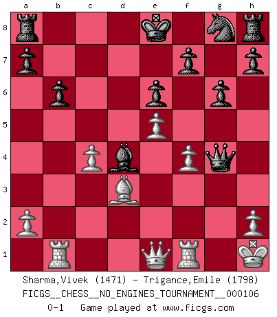 Last move : 0-1 2019 July 23 8:7:40 [Event "FICGS__CHESS__NO_ENGINES_TOURNAMENT__000106"] [Site "FICGS"] [Date "2019.04.01"] [Round "1"] [White "Sharma,Vivek"] [Black "Trigance,Emile"] [Result "0-1"] [WhiteElo "1471"] [BlackElo "1798"] 1.e4 c5 2.Nf3 d6 3.d4 cxd4 4.c3 dxc3 5.bxc3 Qc7 6.Bd3 g6 7.O-O Bg7 8.Bb2 Nc6 9.Nbd2 Bg4 10.c4 Bxb2 11.Rb1 Bg7 12.Qe1 e6 13.Nb3 Bxf3 14.gxf3 Qe7 15.f4 Nd4 16.Nxd4 Bxd4 17.e5 dxe5 18.fxe5 Qg5+ 19.Kh1 b6 20.f4 Qg4 0-1 Sicilian Kingside Castling by player White (move 7) Player Black won this chess game. Follow this game move after move (download)Pawn endings are to Chess what putting is to golf. (Cecil Purdy) Ich weiss nicht was Gott gegen mich auf 1.e4 antworten würde. (Robert James Fischer) El Ajedrez es realmente noventa y nueve por ciento calculación. (Soltis) Horreur, mais aussi harmonie suprême : qu'y avait-il en effet au monde en dehors des échecs ? Le brouillard, l'inconnu, le non-être... (Vladimir Nabokov) Once you start thinking you have nothing left to learn, you have everything to learn. (Steve Badget)