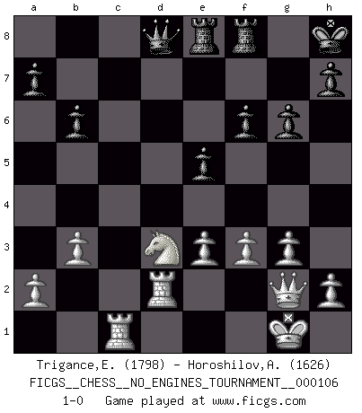 Last move : 1-0 2019 August 19 22:56:23 [Event "FICGS__CHESS__NO_ENGINES_TOURNAMENT__000106"] [Site "FICGS"] [Date "2019.04.01"] [Round "1"] [White "Trigance,Emile"] [Black "Horoshilov,Andrey"] [Result "1-0"] [WhiteElo "1798"] [BlackElo "1626"] 1.c4 c5 2.Nc3 Nc6 3.g3 b6 4.Bg2 Bb7 5.Nf3 e6 6.O-O Nf6 7.d4 Na5 8.b3 d5 9.cxd5 Nxd5 10.Nxd5 Qxd5 11.dxc5 Bxc5 12.Bd2 Nc6 13.Ne1 Qd7 14.Nd3 Bd6 15.Bc3 O-O 16.e3 f6 17.Rc1 Ba6 18.Re1 e5 19.Bb2 Bb7 20.Bd5+ Kh8 21.Qf3 Rae8 22.Bxc6 Bxc6 23.Qxc6 Qe7 24.Qg2 Ba3 25.Bxa3 Qxa3 26.f3 Qe7 27.Rc2 g6 28.Rec1 Qd8 29.Rd2 1-0 English : Symmetrical variation Kingside Castling by player White (move 6) Kingside Castling by player Black (move 15) Player White won this chess game. Follow this game move after move (download)A thorough understanding of the typical mating continuations makes the most complicated sacrificial combinations leading up to them not only not difficult, but almost a matter of course. (Siegbert Tarrasch) Schach wird sich dank seiner hohen kulturellen Tradition immer durchsetzen. In näherer Zukunft womöglich sogar als Gegenreaktion auf die maßlose Reizüberflutung im Freizeit- und Spielbereich. (Garry Kasparov) Solo puedes ser bueno en el Ajedrez si amas al juego. (Bobby Fischer) On peut tirer plus d'utilité d'une partie perdue que de 100 parties gagnées. (Capablanca) The real danger is not that computers will begin to think like men, but that men will begin to think like computers. (Sydney J. Harris)
