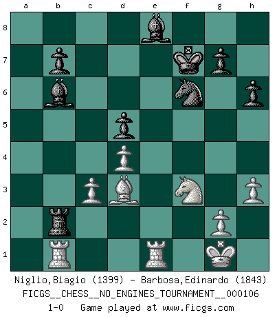 Last move : 1-0 2019 May 19 0:30:44 [Event "FICGS__CHESS__NO_ENGINES_TOURNAMENT__000106"] [Site "FICGS"] [Date "2019.04.01"] [Round "1"] [White "Niglio,Biagio"] [Black "Barbosa,Edinardo"] [Result "1-0"] [WhiteElo "1399"] [BlackElo "1843"] 1.d4 Nf6 2.Nf3 d5 3.Bf4 e6 4.e3 c5 5.c3 Nc6 6.Nbd2 Qb6 7.Qb3 Qxb3 8.axb3 cxd4 9.exd4 Be7 10.h3 Bd7 11.Bd3 O-O 12.O-O a6 13.Ne5 Be8 14.Bh2 Rc8 15.f4 Nd7 16.Nxc6 Rxc6 17.f5 Bg5 18.Bf4 Bf6 19.Nf3 Be7 20.Rfe1 Bd8 21.b4 h6 22.b5 axb5 23.Bxb5 Rb6 24.Bd3 Rxb2 25.Bd6 Bb6 26.Bxf8 Kxf8 27.fxe6 Nf6 28.exf7 Kxf7 29.Rab1 1-0 Queen's pawn game Kingside Castling by player Black (move 11) Kingside Castling by player White (move 12) Player White won this chess game. Follow this game move after move (download)Chess is a terrific way for kids to build self image and self esteem. (Saudin Robovic) Mein Name ist Rustam Kamsky. Sie haben meinen Sohn belästigt. Bereiten Sie sich aufs Sterben vor. (Rustam Kamsky) La batalla por la última verdad nunca sera ganada. Y es por eso que el Ajedrez es tan fascinante. (Hans Kmoch) Aux échecs, les retours au sommet sont rares : les dommages psychologiques consécutifs à une défaite sont trop sévères. (Daily Telegraph) All politicians must be presumed guilty until they are proven innocent. (Dinesh De Silva)