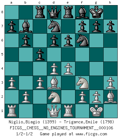 Last move : 1/2-1/2 2019 April 17 9:11:46 [Event "FICGS__CHESS__NO_ENGINES_TOURNAMENT__000106"] [Site "FICGS"] [Date "2019.04.01"] [Round "1"] [White "Niglio,Biagio"] [Black "Trigance,Emile"] [Result "1/2-1/2"] [WhiteElo "1399"] [BlackElo "1798"] 1.d4 Nf6 2.Nf3 b6 3.Bf4 Bb7 4.e3 e6 5.h3 d6 6.Bd3 Be7 7.O-O O-O 8.Nbd2 Nbd7 9.Bh2 c5 10.c3 Re8 11.Re1 Bf8 12.e4 Rc8 13.a3 1/2-1/2 Queen's Indian defense Kingside Castling by player White (move 7) Kingside Castling by player Black (move 7) This chess game ended in a draw. Follow this game move after move (download)With or without the title, Bobby Fischer was unquestionably the greatest player of his time. (Burt Hochberg) Im Schach gewinnt jeder. Hat man Freunde am Spiel - und das ist die Hauptsache - ist auch der Verlust einer Partie kein Unglück. (David Bronstein) Aún deseo matar a Fischer. (Boris Spassky) Karpov est une pièce de musée. (Garry Kasparov) The Movers & Shakers of this world are those who play chess in the mornings and go to the disco in the evenings. (Dinesh De Silva)
