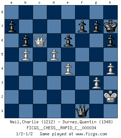 Last move : 1/2-1/2 2007 August 19 0:58:18 [Event "FICGS__CHESS__RAPID_C__000034"] [Site "FICGS"] [Date "2007.06.06"] [Round "1"] [White "Neil,Charlie"] [Black "Durnez,Quentin"] [Result "1/2-1/2"] [WhiteElo "1212"] [BlackElo "1348"] 1.d4 d5 2.c4 e6 3.Nf3 Nf6 4.Bg5 Nbd7 5.e3 Be7 6.Nc3 O-O 7.cxd5 Nxd5 8.Bxe7 Qxe7 9.Bd3 N7b6 10.O-O Bd7 11.h4 Nf6 12.Qc2 h6 13.Ne4 Nbd5 14.a3 Bc6 15.b4 Qd7 16.Ne5 Qe8 17.Rac1 Ba4 18.Qb1 Bb5 19.Nxf6+ Nxf6 20.Bxb5 Qxb5 21.Rxc7 Rac8 22.Rxc8 Rxc8 23.Rc1 Rd8 24.Rc5 Qe8 25.Qc2 Nd5 26.b5 b6 27.Rc6 Qe7 28.g3 Qxa3 29.Rc8 Qf8 30.Rxd8 Qxd8 31.Qc6 Qe7 32.e4 Nb4 33.Qa8+ Kh7 34.Nc6 Nxc6 35.Qxc6 Qb4 36.d5 Qe1+ 37.Kh2 Qxf2+ 38.Kh3 Qf1+ 39.Kh2 Qe2+ 40.Kh3 Qf1+ 41.Kh2 Qf2+ 42.Kh3 Qf1+ 43.Kh2 1/2-1/2 QGD Kingside Castling by player Black (move 6) Kingside Castling by player White (move 10) This chess game ended in a draw. Follow this game move after move (download)The tactician knows what to do when there is something to do; whereas the strategian knows what to do when there is nothing to do. (Gerald Abrahams) Gewöhnliche Menschen denken nur daran, wie sie ihre Zeit verbringen. Ein intelligenter Mensch versucht, sie auszunutzen. (Arthur Schopenhauer) Ayuda a tus piezas para que ellas te puedan ayudar. (Paul Morphy) Celui qui prend des risques peut perdre, celui qui n'en prend pas perd toujours. (Xavier Tartacover) Experience is the name we all give to our mistakes. (Oscar Wilde)