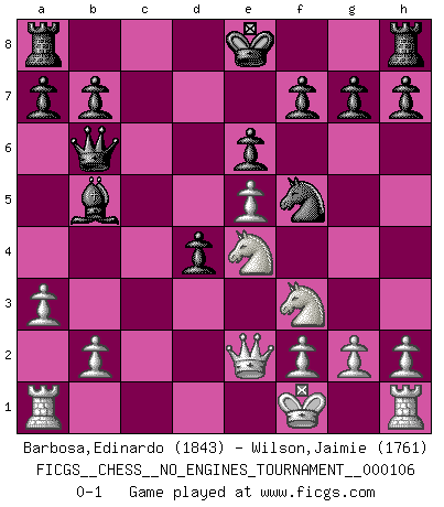 Last move : 0-1 2019 May 21 18:18:18 [Event "FICGS__CHESS__NO_ENGINES_TOURNAMENT__000106"] [Site "FICGS"] [Date "2019.04.01"] [Round "1"] [White "Barbosa,Edinardo"] [Black "Wilson,Jaimie"] [Result "0-1"] [WhiteElo "1843"] [BlackElo "1761"] 1.e4 e6 2.d4 d5 3.e5 c5 4.c3 Qb6 5.Nf3 Nc6 6.Bd3 cxd4 7.cxd4 Bd7 8.Be2 Nge7 9.Nc3 Nf5 10.Na4 Bb4+ 11.Bd2 Qa5 12.Bxb4 Qxb4+ 13.Kf1 Ncxd4 14.Nc3 Nxe2 15.Qxe2 d4 16.a3 Qb6 17.Ne4 Bb5 0-1 French : Advance variation Player Black won this chess game. Follow this game move after move (download)When you play Bobby, it is not a question if you win or lose. It is a question if you survive. (Boris Spassky) Es gibt zwei Arten von Opfern: Korrekte und meine. (Mikhail Nekhemyevich Tal) El Ajedrez es parte de la cultura, y si una cultura esta en decadencia, entonces también el Ajedrez declinará. (Mikhail Botvinnik) Il (Jacob Murray) ne joue pas pour le bon coup, mais pour le meilleur. (Eloi Relange) I don't know, I don't care, and it doesn't make any difference. (Albert Einstein)