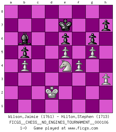 Last move : 1-0 2019 June 26 20:12:22 [Event "FICGS__CHESS__NO_ENGINES_TOURNAMENT__000106"] [Site "FICGS"] [Date "2019.04.01"] [Round "1"] [White "Wilson,Jaimie"] [Black "Hilton,Stephen"] [Result "1-0"] [WhiteElo "1761"] [BlackElo "1713"] 1.e4 c5 2.Nf3 d6 3.Bb5+ Bd7 4.Bxd7+ Qxd7 5.O-O Nc6 6.Re1 Nf6 7.c3 g6 8.d4 cxd4 9.cxd4 Bg7 10.Nc3 O-O 11.Bf4 Rfe8 12.Qd2 Rad8 13.Rac1 e5 14.Bg5 Rc8 15.dxe5 Nxe5 16.Nxe5 Rxe5 17.f3 R5e8 18.Red1 a6 19.Qxd6 Qxd6 20.Rxd6 Re6 21.Rxe6 fxe6 22.Na4 Rxc1+ 23.Bxc1 Nd7 24.b4 b5 25.Nb2 Bd4+ 26.Kf1 Kf7 27.Ke2 Ne5 28.f4 Nc6 29.Nd3 Bg1 30.h3 Bb6 31.Be3 Bc7 32.g4 a5 33.a3 axb4 34.axb4 Bd6 35.Bc5 Ke7 36.g5 Kd7 37.Kd2 Ne7 38.e5 Bc7 39.Bxe7 Kxe7 40.Nc5 Bb6 41.Ne4 1-0 Sicilian : Canal-Sokolsky attack, 3...Bd7 Kingside Castling by player White (move 5) Kingside Castling by player Black (move 10) Player White won this chess game. Follow this game move after move (download)Chess is a more highly symbolic game, but the aggressions are therefore even more frankly represented in the play. It probably began as a war game; that is, the representation of a miniature battle between the forces of two kingdoms. (Karl Meninger) Den Ruhm habe ich schon, jetzt brauche ich noch das Geld. (Wilhelm Steinitz) El Ajedrez es el gimnasio de la mente. (Blaise Pascal) Je fais ceci parce que dans cinquante coups j'obtiendrai cela; je m'appelle Mikhail Moisevitch Botvinnik. (Botvinnik) Life is pain my dear and anyone who says otherwise is selling something. (Princess Bride)