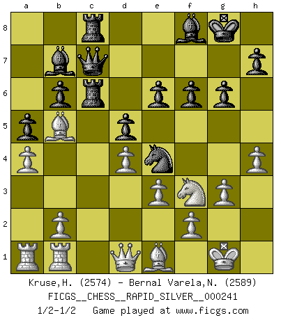 Last move : 1/2-1/2 2019 August 10 18:18:57 [Event "FICGS__CHESS__RAPID_SILVER__000241"] [Site "FICGS"] [Date "2019.04.04"] [Round "1"] [White "Kruse,Herbert"] [Black "Bernal Varela,Nelson"] [Result "1/2-1/2"] [WhiteElo "2574"] [BlackElo "2589"] 1.Nf3 d5 2.d4 Nf6 3.c4 e6 4.g3 Bb4+ 5.Bd2 Be7 6.Bg2 O-O 7.O-O c6 8.Qb3 b6 9.Nc3 Ba6 10.cxd5 cxd5 11.Ne5 Bb7 12.Rac1 Nbd7 13.Nd3 Nb8 14.Qa4 a6 15.e3 Nc6 16.a3 Rc8 17.Ra1 Ne8 18.Rfc1 Nd6 19.Be1 Re8 20.Bf1 Bf8 21.Qd1 Nc4 22.Nb1 a5 23.Nd2 Nd6 24.Qb3 g6 25.Ne5 Bg7 26.Ndf3 f6 27.Nxc6 Rxc6 28.h4 Bf8 29.a4 Qc7 30.Qd1 Rc8 31.Rcb1 Ne4 32.Bb5 Rc2 33.Bd3 Rc6 34.Bb5 Rc2 35.Bd3 Rc6 36.Bb5 1/2-1/2 Reti Opening Kingside Castling by player Black (move 6) Kingside Castling by player White (move 7) This chess game ended in a draw. Follow this game move after move (download)Fischer was a master of clarity and a king of artful positioning. His opponents would see where he was going but were powerless to stop him. (Bruce Pandolfini) Sitze auf Deine Hände. (Siegbert Tarrasch) Los Peones son nacidos libres, y aún así, se encuentran por doquier encadenados. (Rick Kennedy) Les échecs sont un jeu terrible. Si vous n'avez pas le centre, votre adversaire a une position plus libre. Par contre, si vous avez le centre, alors vous avez vraiment quelque chose pour laquelle vous inquiéter ! (Siegbert Tarrasch) The man who strikes first admits that his ideas have given out. (Chinese proverb)