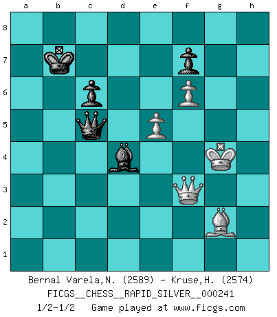 Last move : 1/2-1/2 2019 July 6 1:4:20 [Event "FICGS__CHESS__RAPID_SILVER__000241"] [Site "FICGS"] [Date "2019.04.04"] [Round "2"] [White "Bernal Varela,Nelson"] [Black "Kruse,Herbert"] [Result "1/2-1/2"] [WhiteElo "2589"] [BlackElo "2574"] 1.e4 e5 2.Nf3 Nc6 3.Bb5 Nf6 4.d3 Bc5 5.c3 O-O 6.O-O d6 7.Re1 Ng4 8.Re2 Bb6 9.d4 Nf6 10.Be3 h6 11.Nbd2 Ng4 12.Nc4 Nxe3 13.fxe3 Na5 14.Nxa5 Bxa5 15.dxe5 Bg4 16.Bc4 dxe5 17.Qe1 Bxf3 18.gxf3 c6 19.Qg3 Bc7 20.Rf1 Qf6 21.f4 Rae8 22.Qg4 b5 23.Bb3 Bb6 24.Kh1 Kh8 25.a4 bxa4 26.Bxa4 g5 27.f5 Kg7 28.Rg1 Rg8 29.Kg2 Kf8 30.Kf3 Rd8 31.Qh5 Ke7 32.Bb3 a5 33.Bc4 Rd7 34.h4 Kd8 35.hxg5 Rxg5 36.Rxg5 hxg5 37.Rg2 Kc7 38.Be2 Qd6 39.Qxg5 a4 40.f6 Qc5 41.Rh2 a3 42.bxa3 Qxc3 43.Rh8 Rd6 44.Kg4 Qa1 45.Bf3 Rd1 46.Rh2 Rg1+ 47.Rg2 Rxg2+ 48.Bxg2 Qd1+ 49.Kh4 Qg1 50.Qxe5+ Kb7 51.Qg3 Bxe3 52.Kh3 Qc1 53.e5 Qxa3 54.Qf3 Qc5 55.Kg4 Bd4 1/2-1/2 Ruy Lopez : Berlin defense Kingside Castling by player Black (move 5) Kingside Castling by player White (move 6) 10 pieces endgame at move 53 : White KQBPP , Black KQBPP WHITE : King + 1 Queen 1 Bishop 2 Pawns BLACK : King + 1 Queen 1 Bishop 2 Pawns This chess game ended in a draw. Follow this game move after move (download)Dazzling combinations are for the many, shifting wood is for the few. (Georg Kieninger) Schach ist das schnellste Spiel der Welt, weil man in jeder Sekunde Tausende von Gedanken ordnen muß. (Albert Einstein) Un jugador que trata de regresar una movida en el Ajedrez es un futuro carterista. (Richard Fenton) Horreur, mais aussi harmonie suprême : qu'y avait-il en effet au monde en dehors des échecs ? Le brouillard, l'inconnu, le non-être... (Vladimir Nabokov) You can't play chess if you're groggy from pills. (Anatoly Karpov)