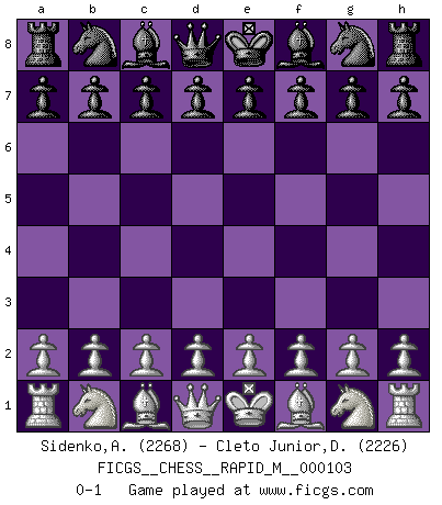 Last move : 0-1 2019 May 5 19:26:47 [Event "FICGS__CHESS__RAPID_M__000103"] [Site "FICGS"] [Date "2019.04.05"] [Round "1"] [White "Sidenko,Anatoly"] [Black "Cleto Junior,Dirceu"] [Result "0-1"] [WhiteElo "2268"] [BlackElo "2226"] 0-1 This chess game has been lost on time (started : 2019.04.05 17:24:57) Player Black won this chess game. Follow this game move after move (download)Alekhine is a poet who creates a work of art out of something that would hardly inspire another man to send home a picture post card. (Max Euwe) Um dein Spiel zu verbessern musst du zuallererst das Endspiel studieren, denn diese kann unabhängig studiert werden. Die Eröffnung und das Mittelspiel müssen immer in Bezug gesetzt werden zum Endspiel. (José Raúl Capablanca) Fischer no está bajo la obligación de nadie. (Joseph Platz) Tout change constamment, y compris dans le monde des Echecs. (Botvinnik) There is no instance of a country having benefited from prolonged warfare. (Sun Tzu)