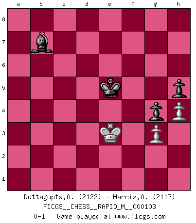 Last move : 0-1 2019 July 14 17:13:24 [Event "FICGS__CHESS__RAPID_M__000103"] [Site "FICGS"] [Date "2019.04.05"] [Round "1"] [White "Duttagupta,Aniruddha"] [Black "Marciz,Alexander"] [Result "0-1"] [WhiteElo "2122"] [BlackElo "2117"] 1.d4 d5 2.c4 c6 3.Nf3 Nf6 4.Nc3 e6 5.Bg5 h6 6.Bh4 dxc4 7.e4 g5 8.Bg3 b5 9.Be2 Bb7 10.h4 g4 11.Ne5 Nbd7 12.Nxd7 Qxd7 13.Be5 Qe7 14.b3 Rg8 15.O-O Bg7 16.g3 Rd8 17.Qc2 c5 18.Rad1 b4 19.Na4 cxd4 20.Bxd4 Nxe4 21.Bxg7 Rxd1 22.Rxd1 Rxg7 23.Bxc4 Kf8 24.Bd3 Nf6 25.Qc1 Bf3 26.Rd2 Rg8 27.Be2 Ba8 28.Qc5 Qxc5 29.Nxc5 a5 30.a3 bxa3 31.Ra2 Bf3 32.Bc4 Kg7 33.Rxa3 Rd8 34.Ra1 a4 35.Nxa4 Ne4 36.Nb2 Nxf2 37.Kxf2 Rd2+ 38.Ke3 Rxb2 39.Rg1 Kf6 40.Kd4 e5+ 41.Kc3 Ra2 42.b4 Ra3+ 43.Kb2 Ra7 44.Rc1 e4 45.b5 Rb7 46.Kc3 Ke5 47.Ra1 f5 48.Ra8 Re7 49.b6 e3 50.Ra5+ Kf6 51.Bd3 e2 52.Rxf5+ Ke6 53.Kd2 Rd7 54.Rf8 Ke7 55.b7 Rxd3+ 56.Kxd3 Bxb7 57.Kxe2 Kxf8 58.Ke3 h5 59.Kf4 Ke7 60.Kg5 Ke6 61.Kf4 Kf6 62.Ke3 Ke5 0-1 QGD Slav : 4.Nc3 Kingside Castling by player White (move 15) 10 pieces endgame at move 56 : White KRPPP , Black KBPPP WHITE : King + 1 Rook 3 Pawns BLACK : King + 1 Bishop 3 Pawns 9 pieces endgame at move 56 : White KRPP , Black KBPPP WHITE : King + 1 Rook 2 Pawns BLACK : King + 1 Bishop 3 Pawns 8 pieces endgame at move 57 : White KRPP , Black KBPP WHITE : King + 1 Rook 2 Pawns BLACK : King + 1 Bishop 2 Pawns 7 pieces endgame at move 57 : White KPP , Black KBPP WHITE : King + 2 Pawns BLACK : King + 1 Bishop 2 Pawns Player Black won this chess game. Follow this game move after move (download)Don't even mention losing to me. I can't stand to think of it. (Bobby Fischer) Offensichtlich kennt Kasparow nichts anderes als Schach, und ich könnte 500 weitere Spieler dieser Sorte benennen. (Judith Polgar) Con o sin el título, Bobby Fischer fue sin lugar a dudas el mas grande jugador de su época. (Burt Hochberg) Ce qui caractérise les parties de combat, c'est que si le défenseur a constamment de difficiles problèmes à résoudre, l'attaquant doit chercher sans relâche de nouvelles possibilités d'attaque. (Koblentz) The arrogant army will lose certainly the battle. (Chinese proverb)