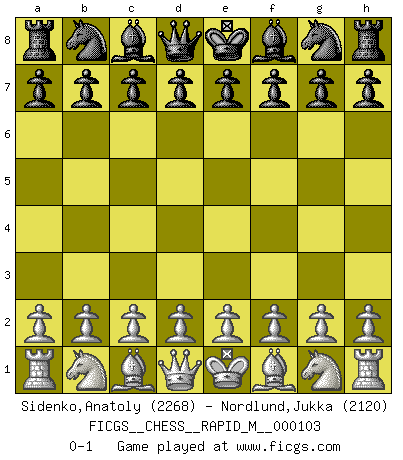 Last move : 0-1 2019 May 5 19:26:47 [Event "FICGS__CHESS__RAPID_M__000103"] [Site "FICGS"] [Date "2019.04.05"] [Round "1"] [White "Sidenko,Anatoly"] [Black "Nordlund,Jukka"] [Result "0-1"] [WhiteElo "2268"] [BlackElo "2120"] 0-1 This chess game has been lost on time (started : 2019.04.05 17:24:57) Player Black won this chess game. Follow this game move after move (download)A sacrifice is best refuted by accepting it. (Wilhelm Steinitz) Kasparov stellt für gewöhnlich die Regeln auf und bricht sie dann selbst wieder. (Alexej Shirov) Cada Peón es una Reina en potencia. (James Mason) Botvinnik disait en comparant les échecs à la musique: Il existe une science dont le but est l'étude de l'acoustique et des sons. Mais il y a aussi un art qui se sert de l'océan des sons : c'est la musique. De toute évidence, il en est de même pour la pensée. La logique est l'étude des lois de la réflexion et les échecs reflètent, en tant qu'art, le côté logique de la réflexion, sous la forme d'images artistiques... Extrait de Fischer - Spassky, Reykjavik 1972 par Alexander & F. Wyndham (Ed. Solar), p 37. Programmer - an organism that turns coffee into software. (Anonymous)