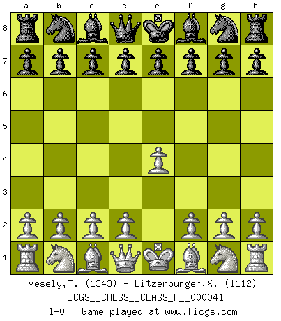 Last move : 1-0 2007 July 20 23:54:46 [Event "FICGS__CHESS__CLASS_F__000041"] [Site "FICGS"] [Date "2007.06.09"] [Round "1"] [White "Vesely,Tomas"] [Black "Litzenburger,Xavier"] [Result "1-0"] [WhiteElo "1343"] [BlackElo "1112"] 1.e4 1-0 This chess game has been lost on time (started : 2007.06.09 15:13:53) King's pawn Opening Player White won this chess game. Follow this game move after move (download)Methodical thinking is of more use in Chess than inspiration. (C. J. S. Purdy) Schach sollte überall auf der Welt Schulfach werden. Es fördert die geistige Auseinandersetzung. Es lehrt die Demut in der Niederlage. (Garry Kasparov) Cuando estes solo, cuando te sientas un extraño en el mundo, juega al Ajedrez. Esto levantará tu espiritu y será tu consejero de guerra. (Aristóteles) Les Echecs sont affaire de jugement sensible. Savoir quand frapper et quand esquiver. (Fischer) 'preceded by its own quotation yields a falsehood' preceded by its own quotation yields a falsehood. (W. V. O. Quine - Set Theory And Its Logic, 1953)
