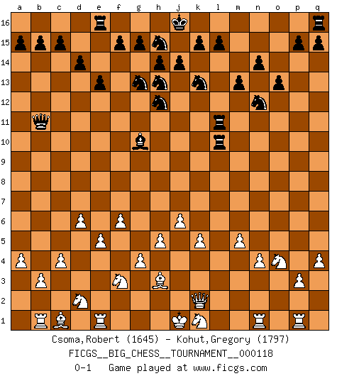 Last move : 0-1 2019 June 30 6:35:8 [Event "FICGS__BIG_CHESS__TOURNAMENT__000118"] [Site "FICGS"] [Date "2019.04.06"] [Round "1"] [White "Csoma,Robert"] [Black "Kohut,Gregory"] [Result "0-1"] [WhiteElo "1645"] [BlackElo "1797"] 1.a2-a4 j15-k13 2.b2-b3 h16-o10 3.g2-g3 o10-o2 4.p1-q3 o2-o10 5.d2-d3 m15-m13 6.e2-e4 o10-c10 7.c2-c4 c10-l2 8.k1-l3 l2-b11 9.b1-d2 b16-c14 10.f2-f4 e15-e13 11.h3-h4 l16-p12 12.j3-j4 f16-c13 13.k2-k4 n15-n14 14.m2-m4 c13-h8 15.a1-b1 o15-o13 16.n2-n3 p16-o14 17.p2-p3 p12-k7 18.q1-p1 d15-d14 19.e4-e5 o16-g9 20.q3-o4 g16-j15 21.g3-g4 c16-l8 22.f1-h3 h15-g13 23.g1-f3 k16-h15 24.d3-d4 e16-e14 25.d4-d5 a16-e16 26.f4-f5 o14-n12 27.h4-h5 m16-m14 28.j4-j5 m14-l14 29.q2-q4 e14-f14 30.o1-q3 l8-q3 31.o4-q3 c14-d12 32.q3-o4 l14-l11 33.j5-j6 k7-g10 34.k4-k5 h8-g7 35.l1-k2 d12-f11 36.h1-g2 g7-a13 37.d5-d6 g9-f8 38.f5-f6 f8-l3 39.k2-l3 a13-l3 40.j2-l3 l11-l3 41.m1-n1 f11-h12 42.m4-m5 f14-f11 43.n3-n4 f11-l11 44.h2-k1 l3-l10 45.g2-k2 j15-h13 0-1 This big chess game has been lost on time (started : 2019.04.06 1:6:38) Follow this game move after move (download)Pawn endings are to Chess what putting is to golf. (Cecil Purdy) Ich möchte Schüler heranbilden, die das Vermögen haben, selbst zu denken und Kritik zu üben. (Emanuel Lasker) Los problemas de Ajedrez exigen del compositor las mismas virtudes que caracterizan todo el arte de valor: originalidad, invención, concisión, armonía, complejidad e insinceridad explendida. (Vladimir Nabokov) Il (Jacob Murray) ne joue pas pour le bon coup, mais pour le meilleur. (Eloi Relange) If you don't practice you don't deserve to win. (Andre Agassi)