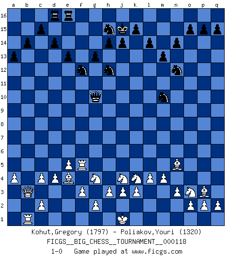 Last move : 1-0 2019 June 23 1:10:11 [Event "FICGS__BIG_CHESS__TOURNAMENT__000118"] [Site "FICGS"] [Date "2019.04.06"] [Round "1"] [White "Kohut,Gregory"] [Black "Poliakov,Youri"] [Result "1-0"] [WhiteElo "1797"] [BlackElo "1320"] 1.j2-k4 m15-m13 2.e2-e4 l16-o13 3.h1-o7 n15-n14 4.o7-f15 g16-f14 5.f15-o7 j15-k13 6.f1-b5 h16-l13 7.b1-c3 f14-h13 8.d2-d3 p16-o14 9.m2-m4 e15-e13 10.l1-p5 f16-c13 11.n2-n3 o16-m14 12.p1-o3 m14-n13 13.o1-f9 l15-l14 14.m1-m3 n13-c3 15.b2-c3 e16-e14 16.h2-g4 g15-g13 17.k1-h2 e14-f14 18.m3-l3 l13-m12 19.c1-d2 a15-a13 20.g1-j2 b15-b14 21.e1-e3 k16-m15 22.q1-m1 c16-b15 23.e3-f3 d15-d14 24.a1-e1 b16-d15 25.e1-e3 a16-f16 26.f9-c6 o13-m11 27.f3-f14 f16-f14 28.d3-d4 m12-n12 29.f2-f3 f14-f12 30.p5-o4 f12-e12 31.a2-a4 n12-k12 32.c6-g10 e12-e7 33.o7-o5 b15-c16 34.e3-e1 j16-j15 35.o5-m5 d15-f14 36.m5-m11 e7-m7 37.m11-f5 c16-k9 38.f5-d5 h13-j11 39.g10-c6 o14-n12 40.c6-h11 h15-j13 41.h11-k9 k12-k9 42.h2-j4 m15-o14 43.d5-o5 k9-a9 44.e4-e5 m7-f7 45.l3-l9 a9-b8 46.l9-f9 f7-h7 47.f9-f14 m16-d16 48.m1-m3 q16-e16 49.m3-l3 j11-h13 50.f14-f9 k13-h12 51.l3-l6 h7-p7 52.o4-p3 b8-j8 53.o5-f5 j8-g8 54.l2-l4 g8-a2 55.l6-f6 j13-h15 56.f5-d3 a2-g8 57.k2-k3 h13-f12 58.j1-h2 g8-n8 59.c3-c4 n12-o10 60.f9-f8 n8-n4 61.f6-f5 p7-n7 62.h2-j1 o14-n12 63.b5-c6 o10-n8 64.d2-k8 c13-e11 65.f5-n5 n7-n5 66.k8-n5 n8-m10 67.e1-b1 e11-d10 68.f8-f5 d10-k4 69.j2-k4 n4-j8 70.c6-e4 j8-g10 71.d3-b3 1-0 Follow this game move after move (download)The battle for the ultimate truth will never be won. And that's why Chess is so fascinating. (Hans Kmoch) Um dein Spiel zu verbessern musst du zuallererst das Endspiel studieren, denn diese kann unabhängig studiert werden. Die Eröffnung und das Mittelspiel müssen immer in Bezug gesetzt werden zum Endspiel. (José Raúl Capablanca) Ciertamente el estado mental actual de Bobby Fischer es una tragedia. Uno de los mas grandes jugadores de Ajedrez del mundo -el orgullo y pena del Ajedrez Americano. (Frank Brady) Un millionnaire : 'Monsieur Steinitz ! Vous ne participez aux tournois que pour l'argent, alors que moi je n'y viens que pour l'honneur.' Steinitz : 'Chacun joue pour ce qu'il n'a pas'... You must have a dream in order to have it come true. (A.P.J. Kalam)