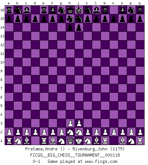 Last move : 0-1 2019 May 6 7:28:5 [Event "FICGS__BIG_CHESS__TOURNAMENT__000118"] [Site "FICGS"] [Date "2019.04.06"] [Round "1"] [White "Pratama,Andre"] [Black "Rivenburg,John"] [Result "0-1"] [WhiteElo ""] [BlackElo "1179"] 0-1 This big chess game has been lost on time (started : 2019.04.06 1:6:38) Follow this game move after move (download)After black's reply to 1.e4 with 1..e5, leaves him always trying to get into the game. (Howard Staunton) Gott hat gewollt, dass ich Champion werde. (Surab Azmajparaschvili) Aquellos que dicen que entienden al Ajedrez, no entienden nada. (Robert Hubner) J'ai vu le vaincu d'Echecs jouer des années durant dans l'espoir de la fête de la victoire. Car tu es plus riche de ce qu'elle existe si même elle n'est point pour toi. Ainsi de la perle du fond des mers. (Antoine de Saint-Exupéry) Humor is by far the most significant activity of the human brain. (Edward De Bono)