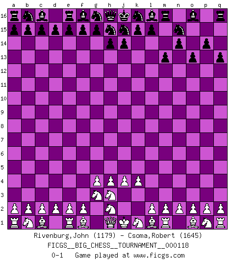 Last move : 0-1 2019 May 19 21:12:34 [Event "FICGS__BIG_CHESS__TOURNAMENT__000118"] [Site "FICGS"] [Date "2019.04.06"] [Round "1"] [White "Rivenburg,John"] [Black "Csoma,Robert"] [Result "0-1"] [WhiteElo "1179"] [BlackElo "1645"] 1.g2-g4 q15-q13 2.k2-k4 p15-p14 3.h3-h4 o15-o13 4.j3-j4 n15-n14 5.j2-g3 p16-n15 6.g1-h3 m15-m13 0-1 This big chess game has been lost on time (started : 2019.04.06 1:6:38) Follow this game move after move (download)All I want to do, ever, is just play Chess. (Bobby Fischer) Es macht mich traurig, wenn ich sehe, dass Golfprofis mehr verdienen als Schachsportler. Obwohl ich davon überzeugt bin, dass wir Schachspieler viel härter trainieren müssen als die Golfer. (Alexandra Kosteniuk) El sobresalir en el Ajedrez es un signo de una mente intrigante. (Sir Arthur Conan Doyle) Il vaut mieux sacrifier les pièces de l'adversaire. (Xavier Tartacover) May I never be complete. May I never be content. May I never be perfect. Deliver me, Tyler, from being perfect and complete. (Chuck Palahniuk, Fight Club)