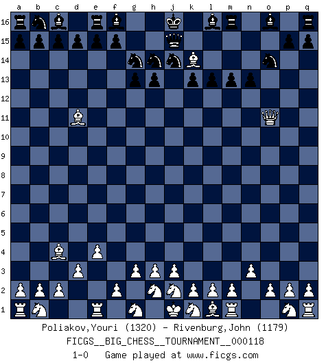 Last move : 1-0 2019 May 28 10:15:24 [Event "FICGS__BIG_CHESS__TOURNAMENT__000118"] [Site "FICGS"] [Date "2019.04.06"] [Round "1"] [White "Poliakov,Youri"] [Black "Rivenburg,John"] [Result "1-0"] [WhiteElo "1320"] [BlackElo "1179"] 1.e2-e4 k15-k13 2.g2-g3 g15-g13 3.h1-f3 j14-j13 4.f3-o11 l15-l14 5.o11-o15 h14-h13 6.f1-c4 k16-j14 7.d2-d3 h15-k14 8.c1-n11 l14-l13 9.o15-o11 m15-m13 10.n2-n3 p16-o14 11.n11-m10 j15-g14 12.o1-l4 g16-h14 13.l4-d11 n15-n13 14.m10-j13 h16-j15 15.j13-k14 1-0 This big chess game has been lost on time (started : 2019.04.06 1:6:38) Follow this game move after move (download)First-class players lose to second-class players because second-class players sometimes play a first-class game. (Siegbert Tarrasch) Schach sollte überall auf der Welt Schulfach werden. Es fördert die geistige Auseinandersetzung. Es lehrt die Demut in der Niederlage. (Garry Kasparov) Cuando estes solo, cuando te sientas un extraño en el mundo, juega al Ajedrez. Esto levantará tu espiritu y será tu consejero de guerra. (Aristóteles) Soyez une menace à chaque fois que vous vous asseyez pour jouer. (Ken Smith) See no evil, hear no evil, speak no evil. (The 3 monkeys)
