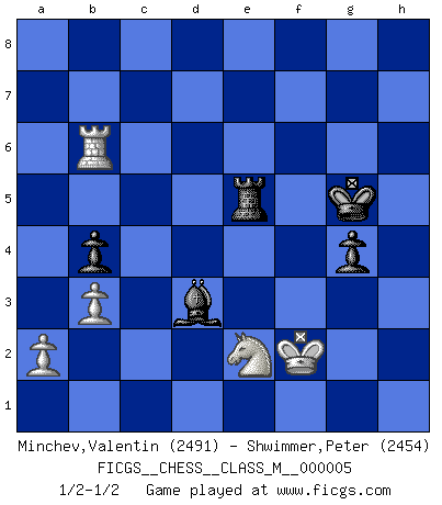Last move : 1/2-1/2 2006 November 7 16:30:11 [Event "FICGS__CHESS__CLASS_M__000005"] [Site "FICGS"] [Date "2006.06.13"] [Round "1"] [White "Minchev,Valentin"] [Black "Shwimmer,Peter"] [Result "1/2-1/2"] [WhiteElo "2491"] [BlackElo "2454"] 1.e4 e5 2.Nf3 Nc6 3.Bb5 Nf6 4.O-O Nxe4 5.d4 Nd6 6.Bxc6 dxc6 7.dxe5 Nf5 8.Qxd8+ Kxd8 9.Nc3 Ke8 10.h3 Be7 11.Bg5 Bxg5 12.Nxg5 h6 13.Nge4 b6 14.Rfd1 Ke7 15.Kh2 g5 16.Ne2 Ke6 17.g4 Kxe5 18.Nd2 Nh4 19.f4+ Kf6 20.Rf1 Kg6 21.Ng3 Re8 22.Rf2 Ba6 23.fxg5 hxg5 24.Nde4 f5 25.gxf5+ Nxf5 26.h4 Nxg3 27.Nxg3 Rf8 28.h5+ Kh7 29.Rxf8 Rxf8 30.Re1 Bc4 31.b3 Bg8 32.c4 b5 33.cxb5 Bd5 34.Re7+ Kh6 35.Kg1 cxb5 36.Rxc7 Rf3 37.Ne2 a6 38.Nc3 Bf7 39.Ne4 g4 40.Rc5 Bxh5 41.Rc6+ Bg6 42.Kg2 Kh5 43.Ng3+ Kg5 44.Rxa6 Rd3 45.Kf2 Rd2+ 46.Ke3 Rd3+ 47.Kf2 Rd7 48.Ne2 Rf7+ 49.Kg3 Rf3+ 50.Kg2 b4 51.Rb6 Re3 52.Kf2 Re4 53.Rd6 Re5 54.Rb6 Bd3 1/2-1/2 Ruy Lopez : Berlin defense, Open variation Kingside Castling by player White (move 4) 10 pieces endgame at move 44 : White KRNPP , Black KRBPP WHITE : King + 1 Rook 1 Knight 2 Pawns BLACK : King + 1 Rook 1 Bishop 2 Pawns This chess game ended in a draw. Follow this game move after move (download)In complicated positions, Bobby Fischer hardly had to be afraid of anybody. (Paul Keres) Wer nie einen Fehler gemacht hat, hat nie etwas Neues ausprobiert. (Albert Einstein) Mi estilo es algo parecido entre un poco de Tal y Petrosian. (Reshevsky) Le plus grand jeu de l'esprit jamais inventé, plus vous l'apprenez, plus vous y prenez du plaisir. (Garry Kasparov) At last I discovered the true beauty of chess. So I proposed to her. (Dinesh De Silva)