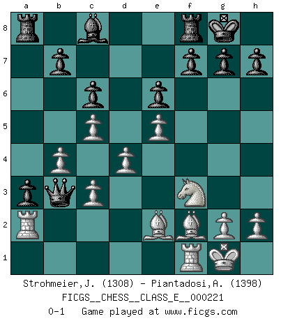 Last move : 0-1 2019 June 12 19:30:7 [Event "FICGS__CHESS__CLASS_E__000221"] [Site "FICGS"] [Date "2019.04.06"] [Round "1"] [White "Strohmeier,Josef"] [Black "Piantadosi,Angelo"] [Result "0-1"] [WhiteElo "1308"] [BlackElo "1398"] 1.e4 Nf6 2.e5 Nd5 3.d4 d6 4.c4 Nb6 5.f4 dxe5 6.fxe5 e6 7.Nf3 Nc6 8.Be3 Bb4+ 9.Nc3 O-O 10.Be2 Bxc3+ 11.bxc3 Na5 12.c5 Nbc4 13.Bf2 c6 14.Qa4 Nb2 15.Qb3 Nxb3 16.axb3 a5 17.Ra2 a4 18.Rxb2 a3 19.Ra2 Qa5 20.b4 Qa4 21.O-O Qb3 0-1 Alekhine's defense : Four pawns attack Kingside Castling by player Black (move 9) Kingside Castling by player White (move 21) Player Black won this chess game. Follow this game move after move (download)He who fears an isolated Queen's Pawn should give up Chess. (Siegbert Tarrasch) Das Zentrum ist der Balkan des Schachbretts - Kriegshandlungen können in jedem Moment ausbrechen. (Aaron Nimzowitsch) No hay precio que sea tan grande por la cabellera del Rey enemigo. (Koblentz) Le moment que je préfère le plus dans une rencontre, c'est celui où je sens que la personnalité de l'adversaire se brise. (Robert Fischer) A mistake is only a mistake if you let it happen twice. Otherwise it is a learning experience. (Daniel Parmet)