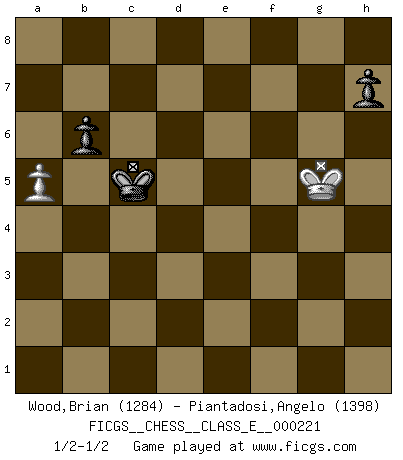 Last move : 1/2-1/2 2019 August 18 22:12:56 [Event "FICGS__CHESS__CLASS_E__000221"] [Site "FICGS"] [Date "2019.04.06"] [Round "1"] [White "Wood,Brian"] [Black "Piantadosi,Angelo"] [Result "1/2-1/2"] [WhiteElo "1284"] [BlackElo "1398"] 1.d4 d5 2.c4 e6 3.Nc3 Nf6 4.Bg5 Be7 5.e3 O-O 6.Nf3 dxc4 7.Bxc4 Nbd7 8.O-O b5 9.Bxb5 Bb7 10.Re1 c5 11.Bxd7 Nxd7 12.Bxe7 Qxe7 13.Qb3 Bxf3 14.gxf3 Qg5+ 15.Kh1 Nf6 16.Rg1 Qh5 17.Qd1 cxd4 18.exd4 Rfd8 19.Rg3 Nd5 20.Nxd5 Rxd5 21.Qg1 g6 22.f4 Rxd4 23.Rg4 Qd5+ 24.Qg2 Rd1+ 25.Rxd1 Qxd1+ 26.Qg1 Qxg1+ 27.Rxg1 Rb8 28.b3 Kf8 29.Rd1 Ke7 30.Kg2 Rd8 31.Rc1 Rd7 32.Rc2 Kf6 33.Re2 Kf5 34.Kf3 Rd3+ 35.Re3 Rxe3+ 36.fxe3 e5 37.e4+ Ke6 38.b4 exf4 39.Kxf4 f6 40.h4 g5+ 41.hxg5 fxg5+ 42.Kxg5 Ke5 43.a4 Kxe4 44.b5 Kd5 45.a5 Kc5 46.b6 axb6 1/2-1/2 QGD : 6.Nf3 Kingside Castling by player Black (move 5) Kingside Castling by player White (move 8) 10 pieces endgame at move 39 : White KPPPP , Black KPPPP WHITE : King + 4 Pawns BLACK : King + 4 Pawns 9 pieces endgame at move 41 : White KPPPP , Black KPPP WHITE : King + 4 Pawns BLACK : King + 3 Pawns 8 pieces endgame at move 41 : White KPPP , Black KPPP WHITE : King + 3 Pawns BLACK : King + 3 Pawns 7 pieces endgame at move 42 : White KPPP , Black KPP WHITE : King + 3 Pawns BLACK : King + 2 Pawns 6 pieces endgame at move 43 : White KPP , Black KPP WHITE : King + 2 Pawns BLACK : King + 2 Pawns 5 pieces endgame at move 46 : White KP , Black KPP WHITE : King + 1 Pawn BLACK : King + 2 Pawns This chess game ended in a draw. Follow this game move after move (download)An attack on the wing should be met by play in the center. (Nimzovitch) Je mehr wir mit Computern analysieren, desto mehr glauben wir an Verteidigung. (Vladimir Kramnik) Personalmente, yo prefiero mirar hacia el futuro en donde un programa de computadora gane el título mundial de Ajedrez. La humanidad necesita una lección de humildad. (Richard Dawkings) Les Echecs sont et restent toujours un combat, un combat intégral comme la boxe, la lutte ou un autre sport, et où il doit y avoir un vainqueur et un vaincu. (Joseph Emil Diemer) A clear conscience is usually the sign of a bad memory. (Unknown)