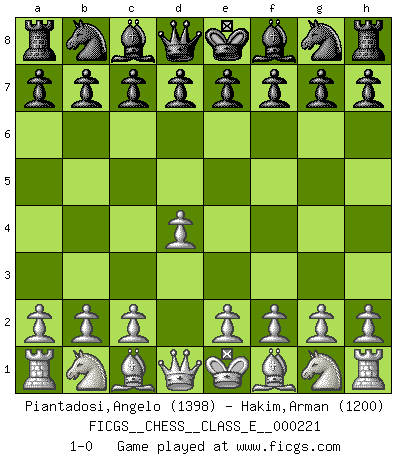 Last move : 1-0 2019 May 17 9:4:38 [Event "FICGS__CHESS__CLASS_E__000221"] [Site "FICGS"] [Date "2019.04.06"] [Round "1"] [White "Piantadosi,Angelo"] [Black "Hakim,Arman"] [Result "1-0"] [WhiteElo "1398"] [BlackElo "1200"] 1.d4 1-0 This chess game has been lost on time (started : 2019.04.06 12:13:17) Queen's pawn Player White won this chess game. Follow this game move after move (download)Chess demands total concentration. (Bobby Fischer) Computer sind die einzigen Gegner, die nicht immer eine Ausrede auf Lager haben, wenn sie gegen mich verlieren. (Robert James Fischer) Ciertamente el estado mental actual de Bobby Fischer es una tragedia. Uno de los mas grandes jugadores de Ajedrez del mundo -el orgullo y pena del Ajedrez Americano. (Frank Brady) Les échecs, c'est la lutte contre l'erreur. (Johannes Zukertort) Life is painting a picture, not doing a sum. (Oliver Wendell Holmes, Jr.)