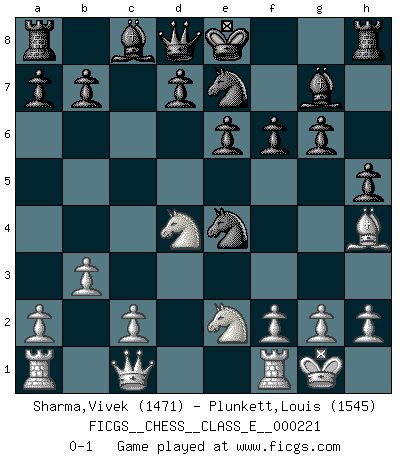 Last move : 0-1 2019 July 14 14:56:39 [Event "FICGS__CHESS__CLASS_E__000221"] [Site "FICGS"] [Date "2019.04.06"] [Round "1"] [White "Sharma,Vivek"] [Black "Plunkett,Louis"] [Result "0-1"] [WhiteElo "1471"] [BlackElo "1545"] 1.e4 c5 2.Nf3 Nc6 3.Nc3 g6 4.Bc4 e6 5.d3 Na5 6.O-O Bg7 7.Bg5 f6 8.Bh4 Ne7 9.d4 Nxc4 10.Qc1 cxd4 11.Nxd4 h5 12.b3 Nd6 13.Nce2 Nxe4 0-1 This chess game has been lost on time (started : 2019.04.06 12:13:17) Sicilian defense Kingside Castling by player White (move 6) Player Black won this chess game. Follow this game move after move (download)No Chess Grandmaster is normal; they only differ in the extent of their madness. (Viktor Korchnoi) Bis zum Jahr 1971 verlief in meiner Schachkariere alles glatt. Dieses dramatische Match [Fischer-Taimanov 6:0] machte mein Leben zur Hölle. (Mark Taimanov) El jugador blanco perdió porque fallo en recordar la coreccta continuación y tuvo que pensar por sí mismo las movidas. (Siegbert Tarrasch) Je menace de comprendre la position. (Anonyme) There is no instance of a country having benefited from prolonged warfare. (Sun Tzu)