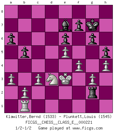 Last move : 1/2-1/2 2019 June 14 19:3:25 [Event "FICGS__CHESS__CLASS_E__000221"] [Site "FICGS"] [Date "2019.04.06"] [Round "1"] [White "Klawitter,Bernd"] [Black "Plunkett,Louis"] [Result "1/2-1/2"] [WhiteElo "1533"] [BlackElo "1545"] 1.e4 c5 2.Nf3 Nc6 3.d4 cxd4 4.Nxd4 g6 5.Nc3 Bg7 6.Nde2 Nf6 7.g3 b5 8.Bg2 Rb8 9.O-O O-O 10.a3 d6 11.Rb1 Nd7 12.Be3 e6 13.Qxd6 Be5 14.Qd2 Qc7 15.f4 Bd6 16.Rfd1 Be7 17.e5 Rd8 18.Qe1 Na5 19.Qf2 a6 20.Ne4 Nc4 21.Kh1 Nxe3 22.Qxe3 Bb7 23.N2c3 Kg7 24.Qe2 Qb6 25.Nd6 Bxg2+ 26.Qxg2 Nc5 27.Nce4 Nxe4 28.Nxe4 Qc6 29.Rxd8 Rxd8 30.c3 Qd5 31.Nf2 Qxg2+ 32.Kxg2 Rd2 33.Kf3 Rc2 34.h4 h5 35.Nd3 Rd2 36.Ke3 Rg2 37.Kf3 Rd2 38.Ke3 Rg2 1/2-1/2 Sicilian : Accelerated Fianchetto, Modern variation Kingside Castling by player White (move 9) Kingside Castling by player Black (move 9) This chess game ended in a draw. Follow this game move after move (download)If your opponent cannot do anything active, then don't rush the position; instead you should let him sit there, suffer, and beg you for a draw. (Jeremy Silman) Ich habe die besten Aussichten, den ersten Preis zu gewinnen - denn jeder muss gegen Steinitz spielen, nur ich nicht! (Wilhelm Steinitz) Yo creo que el Ajedrez posee una magia que es también una ayuda en la edad avanzada. Una rodilla reumática es olvidada durante una partida de Ajedrez y otros eventos pueden parecer algo sin importancia comparada a una catástrofe en el tablero de Ajedrez. (Vlastimil Hort) Les échecs sont utiles à l'exercice de la faculté de penser et à celle de l'imagination. Car nous devons posséder une méthode élaborée pour atteindre des buts partout où nous devons conduire notre raison. (Leibnitz) Gambling is the son of avarice and the father of despair. (French proverb)