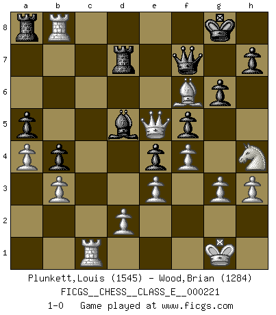 Last move : 1-0 2019 August 9 6:38:51 [Event "FICGS__CHESS__CLASS_E__000221"] [Site "FICGS"] [Date "2019.04.06"] [Round "1"] [White "Plunkett,Louis"] [Black "Wood,Brian"] [Result "1-0"] [WhiteElo "1545"] [BlackElo "1284"] 1.c4 e5 2.g3 Nf6 3.Bg2 Bc5 4.a3 a5 5.Nf3 d6 6.O-O O-O 7.Nc3 Nc6 8.e3 Bg4 9.Qc2 Re8 10.h3 Be6 11.b3 Ba7 12.Nh4 g6 13.Bb2 d5 14.cxd5 Nxd5 15.Ne4 f5 16.Nc5 Bxc5 17.Qxc5 Qd6 18.Qc2 Nf6 19.f4 e4 20.Bxf6 Bf7 21.Qb2 Bd5 22.Bh8 Qe7 23.Bc3 b5 24.Rfc1 Nd8 25.Bf6 Qf7 26.Rab1 Ne6 27.Bf1 b4 28.a4 c5 29.Bb5 Rec8 30.Qe5 Nc7 31.Rxc5 Nxb5 32.Rxb5 Rd8 33.Rc1 Rd7 34.Rb8+ 1-0 English Opening Kingside Castling by player White (move 6) Kingside Castling by player Black (move 6) Player White won this chess game. Follow this game move after move (download)The beauty of a move lies not in its' appearance but in the thought behind it. (Siegbert Tarrasch) Rauchen ist dem Schachspieler bei seiner Arbeit, also im Wettkampf, untersagt. (Viktor Kortschnoi) Yo no le temo a Spassky. Todos saben que yo soy el mejor. Uno no necesita un torneo para probarlo. (Bobby Fischer) La tactique est l'élément le plus important du milieu de jeu. (Siegbert Tarrasch) Locking firmely the window serves nothing, only small thiefs pass through there, the big thiefs enter through the front door. (Luc-Olivier Leclerc)