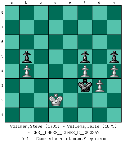Last move : 0-1 2019 May 25 14:22:27 [Event "FICGS__CHESS__CLASS_C__000269"] [Site "FICGS"] [Date "2019.04.07"] [Round "1"] [White "Vollmer,Steve"] [Black "Vellema,Jelle"] [Result "0-1"] [WhiteElo "1793"] [BlackElo "1879"] 1.d4 Nf6 2.c4 e6 3.Nf3 d5 4.Nc3 c6 5.Bg5 Be7 6.e3 Nbd7 7.Bd3 dxc4 8.Bxc4 Nd5 9.Bxe7 Qxe7 10.O-O O-O 11.Rc1 N5f6 12.Qc2 e5 13.dxe5 Nxe5 14.Nxe5 Qxe5 15.h3 Bf5 16.Bd3 Bxd3 17.Qxd3 Rfd8 18.Qc2 Rd6 19.Rfd1 Rad8 20.Rxd6 Rxd6 21.Rd1 h6 22.Rd3 Qe6 23.Qd2 Rxd3 24.Qxd3 Qd7 25.Qxd7 Nxd7 26.Ne4 Kf8 27.Kf1 Ke7 28.Ke2 f5 29.Nc3 g5 30.g3 Nf6 31.f3 h5 32.Kd3 Kd6 33.Kd4 c5+ 34.Kc4 a6 35.a4 Nd7 36.f4 gxf4 37.exf4 Nb6+ 38.Kd3 Nd5 39.b3 Nxc3 40.Kxc3 b5 41.axb5 axb5 42.b4 c4 43.Kd2 Ke6 44.Ke3 Kd5 45.h4 c3 46.Kd3 c2 47.Kxc2 Ke4 48.Kd2 Kf3 0-1 Queen's pawn game Kingside Castling by player White (move 10) Kingside Castling by player Black (move 10) 10 pieces endgame at move 41 : White KPPPP , Black KPPPP WHITE : King + 4 Pawns BLACK : King + 4 Pawns 9 pieces endgame at move 47 : White KPPPP , Black KPPP WHITE : King + 4 Pawns BLACK : King + 3 Pawns Player Black won this chess game. Follow this game move after move (download)Methodical thinking is of more use in Chess than inspiration. (C. J. S. Purdy) Schach ist Kampf, hauptsächlich jedoch gegen die eigenen Fehler. (Savielly Grigorievitsch Tartakower) Yo jugué Ajedrez con el y a veces le pude haber ganado solo que siempre devuelve su última jugada y juega la partida de manera diferente. (Mark Twain) Vouloir jouer aux échecs contre soi-même est aussi paradoxal que vouloir marcher sur son ombre. (Stefan Zweig) To steal ideas from one person is plagiarism. To steal from many is research. (Unknown)