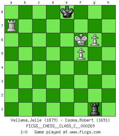 Last move : 1-0 2019 November 9 22:22:0 [Event "FICGS__CHESS__CLASS_C__000269"] [Site "FICGS"] [Date "2019.04.07"] [Round "1"] [White "Vellema,Jelle"] [Black "Csoma,Robert"] [Result "1-0"] [WhiteElo "1879"] [BlackElo "1691"] 1.d4 f5 2.Nf3 Nf6 3.e3 e6 4.c4 Bb4+ 5.Bd2 Bxd2+ 6.Nbxd2 O-O 7.b4 a5 8.b5 b6 9.Bd3 Bb7 10.c5 c6 11.a4 d6 12.Bc4 d5 13.Be2 Nbd7 14.Rc1 Rc8 15.Nb3 e5 16.O-O e4 17.Ng5 Re8 18.Nh3 h6 19.Nf4 Kh7 20.Bh5 Nxh5 21.Qxh5 Qf6 22.Qd1 Qd8 23.cxb6 Qxb6 24.Nc5 Nf6 25.Nh5 Ng8 26.Rb1 Rc7 27.Qd2 Ra8 28.Rfc1 cxb5 29.Rxb5 Qa7 30.Nxb7 Rxb7 31.Rxd5 Ne7 32.Rdc5 Qb6 33.h3 Qb4 34.Qc2 Rab8 35.Qc4 Qxc4 36.R1xc4 Ra8 37.Ng3 R8a7 38.Nxf5 Nxf5 39.Rxf5 Rb4 40.Rfc5 Rab7 41.d5 Kg6 42.d6 Rd7 43.Rxb4 axb4 44.Rb5 Rxd6 45.Rxb4 Kf5 46.Rb5+ Kf6 47.a5 Rd1+ 48.Kh2 Rd2 49.Kg3 Ra2 50.Rb6+ Ke5 51.a6 Kf5 52.Rb5+ Ke6 53.Kf4 Ra4 54.Re5+ Kf6 55.Rxe4 Rxa6 56.h4 Ra2 57.Kg3 g5 58.hxg5+ hxg5 59.f4 Rb2 60.Re5 gxf4+ 61.exf4 Rb3+ 62.Kg4 Rb2 63.g3 Rg2 64.Ra5 Rg1 65.Ra6+ Kf7 66.f5 Rf1 67.Kg5 Rg1 68.g4 Rg2 69.Ra7+ Kf8 70.Kf6 Ke8 71.g5 Rg1 72.g6 1-0 Dutch Kingside Castling by player Black (move 6) Kingside Castling by player White (move 16) 10 pieces endgame at move 55 : White KRPPPP , Black KRPP WHITE : King + 1 Rook 4 Pawns BLACK : King + 1 Rook 2 Pawns 9 pieces endgame at move 58 : White KRPPPP , Black KRP WHITE : King + 1 Rook 4 Pawns BLACK : King + 1 Rook 1 Pawn 8 pieces endgame at move 58 : White KRPPP , Black KRP WHITE : King + 1 Rook 3 Pawns BLACK : King + 1 Rook 1 Pawn 7 pieces endgame at move 60 : White KRPP , Black KRP WHITE : King + 1 Rook 2 Pawns BLACK : King + 1 Rook 1 Pawn 6 pieces endgame at move 61 : White KRPP , Black KR WHITE : King + 1 Rook 2 Pawns BLACK : King + 1 Rook Player White won this chess game. Follow this game move after move (download)There's never before been a Chess player with such a thorough knowledge of the intricacies of the game and such an absolutely indomitable will to win. I think Bobby is the greatest player that ever lived. (Lisa Lane) Du weisst es gibt ein Problem mit Computern und Fernschach, wenn jeder eine Rating von 2450 hat. (John Christen Knudsen) Aquel que teme a un Peón de Reina aislado, debería de retirarse del Ajedrez. (Siegbert Tarrasch) Mais l'homme est une créature légère et illogique : semblable au joueur d'échecs, il n'aime que le processus du but à atteindre, non le but lui-même. (Dostoïevsky) There are more things in heaven and earth than practically anywhere else. (Unknown)