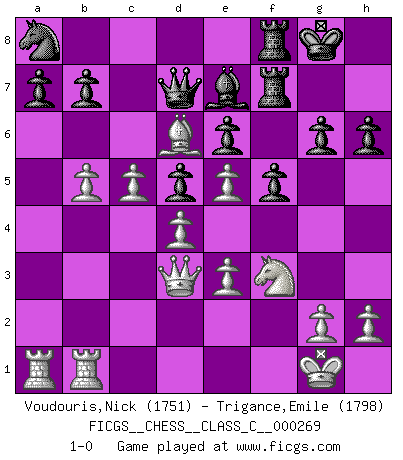Last move : 1-0 2019 April 23 11:48:44 [Event "FICGS__CHESS__CLASS_C__000269"] [Site "FICGS"] [Date "2019.04.07"] [Round "1"] [White "Voudouris,Nick"] [Black "Trigance,Emile"] [Result "1-0"] [WhiteElo "1751"] [BlackElo "1798"] 1.d4 Nf6 2.e3 g6 3.f4 d5 4.Bd3 Bg7 5.Nf3 Bg4 6.O-O Qd7 7.Qe1 Nc6 8.c3 Bf5 9.Qe2 O-O 10.Nbd2 Bxd3 11.Qxd3 e6 12.Ne5 Nxe5 13.fxe5 Ne8 14.b3 f5 15.a4 c6 16.c4 Nc7 17.Nf3 h6 18.Ba3 Rf7 19.Bd6 Bf8 20.c5 Be7 21.b4 Raf8 22.b5 cxb5 23.Rfb1 Na8 24.axb5 1-0 Queen's pawn game Kingside Castling by player White (move 6) Kingside Castling by player Black (move 9) Player White won this chess game. Follow this game move after move (download)Look at Garry Kasparov. After he loses, invariably he wins the next game. He just kills the next guy. That's something that we have to learn to be able to do. (Maurice Ashley) Eine Person mit durchschnittlichem IQ kann etwa eine ELO von 2000 erreichen. (Jonathan Levitt) Tu sabes que vas a perder. Aún cuando tenía la ventaja, yo sabía que iba a perder. - al estar jugando con Fischer (Andrew Soltis) Demandez au pauvre Cg1 ce qu'il en pense. Eduard Gufeld à propos de la variante Saemisch de l'Est-Indienne. Horse racing is animated roulette. (Roger Kahn)