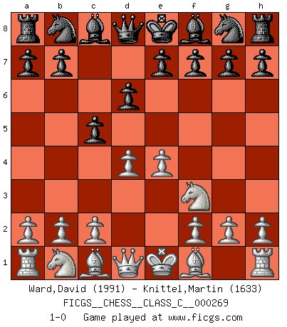 Last move : 1-0 2019 May 18 21:13:7 [Event "FICGS__CHESS__CLASS_C__000269"] [Site "FICGS"] [Date "2019.04.07"] [Round "1"] [White "Ward,David"] [Black "Knittel,Martin"] [Result "1-0"] [WhiteElo "1991"] [BlackElo "1633"] 1.e4 c5 2.Nf3 d6 3.d4 1-0 This chess game has been lost on time (started : 2019.04.07 11:52:55) Sicilian Player White won this chess game. Follow this game move after move (download)Chess holds its master in its own bonds, shackling the mind and brain so that the inner freedom of the very strongest must suffer. (Albert Einstein) Der zweitbeste Zug ist oft der einzig richtige. (Savielly Grigorievitsch Tartakower) La estratégia requiere pensar, la táctica requiere observación. (Max Euwe) Dieu déplace le joueur, et celui-ci la pièce. Quel Dieu derrière Dieu commence donc la trame ? Arturo Perez-Reverte (prix de littérature policière 1993). He who is a good ruler must first have been ruled. (Aristotle)