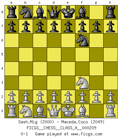 Last move : 0-1 2019 May 18 9:13:29 [Event "FICGS__CHESS__CLASS_A__000209"] [Site "FICGS"] [Date "2019.04.07"] [Round "1"] [White "Sash,Mig"] [Black "Maceda,Coco"] [Result "0-1"] [WhiteElo "2000"] [BlackElo "2049"] 1.Nf3 Nf6 0-1 This chess game has been lost on time (started : 2019.04.07 16:40:58) Reti Opening Player Black won this chess game. Follow this game move after move (download)The mistakes are there, waiting to be made. (Savielly Tartakower) Es genügt nicht ein guter Spieler zu sein, man muß auch gut spielen. (Siegbert Tarrasch) Buenas posiciones no logran ganar juegos, buenas movidas sí. (Gerald Abrahams) Les échecs, c'est l'art d'analyser. (Mikhail Botvinnik) They say in chess you've got to kill the queen, and then you mate it... Oh I, do you ? (Red Hot Chili Peppers, Fortune faded)