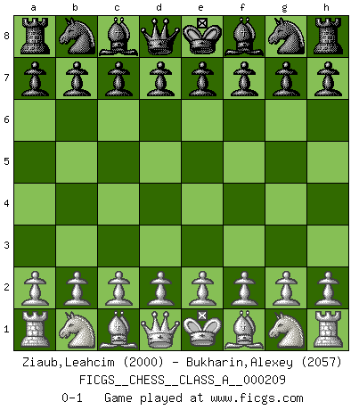 Last move : 0-1 2019 May 17 21:8:21 [Event "FICGS__CHESS__CLASS_A__000209"] [Site "FICGS"] [Date "2019.04.07"] [Round "1"] [White "Ziaub,Leahcim"] [Black "Bukharin,Alexey"] [Result "0-1"] [WhiteElo "2000"] [BlackElo "2057"] 0-1 This chess game has been lost on time (started : 2019.04.07 16:40:58) Player Black won this chess game. Follow this game move after move (download)You know you're going to lose. Even when I was ahead I knew I was going to lose. - On playing against Fischer. (Andrew Soltis) Ich organisiere ein großes Turnier, was mich etwa 120000 Dollar kostet. Ich denke, das ist das erste Mal in der Schachgeschichte, daß ein Schachgroßmeister auch als Mäzen auftritt. (Miguel Najdorf) Yo no creo en la psicología. Yo creo en las buenas movidas. (Bobby Fischer) Même si vous avez un bon coup à faire, regardez toujours s'il n'y en a pas un qui lui soit préférable. (Pedro Damiano) Success without honor is an unseasoned dish; it will satisfy your hunger, but it won't taste good. (Joe Paterno)