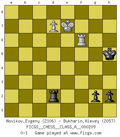 Last move : 0-1 2020 April 7 17:10:54 [Event "FICGS__CHESS__CLASS_A__000209"] [Site "FICGS"] [Date "2019.04.07"] [Round "1"] [White "Novikov,Evgeny"] [Black "Bukharin,Alexey"] [Result "0-1"] [WhiteElo "2106"] [BlackElo "2057"] 1.e4 e5 2.Nf3 Nc6 3.Bb5 a6 4.Ba4 Nf6 5.O-O Be7 6.Bxc6 dxc6 7.Re1 Nd7 8.d3 O-O 9.h3 b6 10.Nbd2 Re8 11.Nc4 Bf8 12.a3 c5 13.c3 Qe7 14.b4 Bb7 15.Qe2 Rad8 16.Be3 Qe6 17.Nfd2 cxb4 18.axb4 Be7 19.f3 Nf8 20.f4 exf4 21.Bxf4 b5 22.Na5 Ba8 23.Qe3 Ng6 24.Bh2 Qd7 25.d4 f5 26.Nab3 fxe4 27.Bg3 Qf5 28.Nxe4 Bh4 29.Bxh4 Nxh4 30.Nbc5 Bxe4 31.Nxe4 Re6 32.Qf2 Rxe4 33.Rxe4 Qxe4 34.Re1 Qxg2+ 35.Qxg2 Nxg2 36.Kxg2 Rd6 37.h4 Rh6 38.Ra1 Kf7 39.Ra3 Rxh4 40.Rxa6 Rh6 41.Ra5 Rb6 42.Kf3 Kg6 43.c4 bxc4 44.Rc5 Rf6+ 45.Ke4 Rf7 46.Rxc4 h5 47.b5 h4 48.Ke5 h3 49.Rc1 Rf5+ 50.Ke6 Rxb5 51.Rxc7 h2 52.Rc1 Rb2 53.d5 Re2+ 54.Kd7 Kf5 55.d6 g5 56.Rf1+ Kg6 57.Kc7 Rc2+ 58.Kd8 g4 59.d7 g3 60.Ke8 Re2+ 61.Kf8 Rd2 62.Ke7 g2 63.Rf6+ Kh5 0-1 Ruy Lopez : Exchange variation doubly deferred (DERLD) Kingside Castling by player White (move 5) Kingside Castling by player Black (move 8) 10 pieces endgame at move 43 : White KRPP , Black KRPPPP WHITE : King + 1 Rook 2 Pawns BLACK : King + 1 Rook 4 Pawns 9 pieces endgame at move 46 : White KRPP , Black KRPPP WHITE : King + 1 Rook 2 Pawns BLACK : King + 1 Rook 3 Pawns 8 pieces endgame at move 50 : White KRP , Black KRPPP WHITE : King + 1 Rook 1 Pawn BLACK : King + 1 Rook 3 Pawns 7 pieces endgame at move 51 : White KRP , Black KRPP WHITE : King + 1 Rook 1 Pawn BLACK : King + 1 Rook 2 Pawns Player Black won this chess game. Follow this game move after move (download)It is peculiar but a fact nevertheless, that gamblers in chess always have enthusiastic followers. (Botvinnik) Es ist nicht das erste mal, dass sich die FIDE dem Arabischen Geld gebeugt hat (über die FIDE WM 2004 in Lybien). (Larry Evans) El Ajedrez es un terrible juego. Si no controlas el centro, tu oponente tiene una posición mas holgada. Si tienes control del centro, ¡entonces realmente tu tienes algo de que preocuparte!. (Siegbert Tarrasch) RxDa4 pat (...) Wisdom begins at the end. (Daniel Webster)