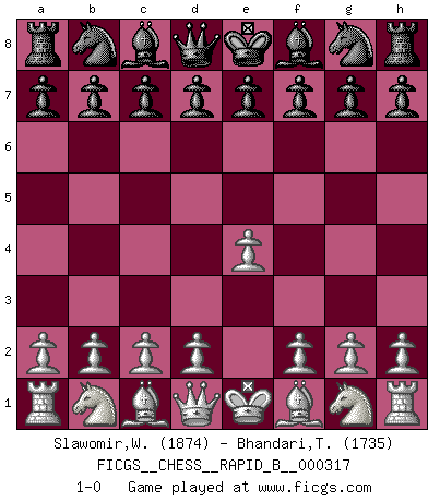 Last move : 1-0 2019 May 8 19:40:45 [Event "FICGS__CHESS__RAPID_B__000317"] [Site "FICGS"] [Date "2019.04.08"] [Round "1"] [White "Slawomir,Weglicki"] [Black "Bhandari,Tulasi"] [Result "1-0"] [WhiteElo "1874"] [BlackElo "1735"] 1.e4 1-0 This chess game has been lost on time (started : 2019.04.08 0:3:48) King's pawn Opening Player White won this chess game. Follow this game move after move (download)Life is a kind of Chess, with struggle, competition, good and ill events. (Benjamin Franklin) Strategie ist, wie man ein Mädchen auf den Rücksitz bekommt. Taktik ist, was man tut, wenn man dann dort ist. (Anonymous) Una buena memoria, concentración, imaginación y una fuerte voluntad, se requiere para llegar a ser un buen jugador. (Bobby Fischer) Ce n'est pas pour s'amuser qu'il joue aux échecs : il célèbre un culte. (Vladimir Nabokov) If you ain't just a little scared when you enter a casino, you are either very rich or you haven't studied the games enough. (Pappy)