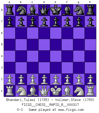 Last move : 0-1 2019 May 8 7:33:22 [Event "FICGS__CHESS__RAPID_B__000317"] [Site "FICGS"] [Date "2019.04.08"] [Round "1"] [White "Bhandari,Tulasi"] [Black "Vollmer,Steve"] [Result "0-1"] [WhiteElo "1735"] [BlackElo "1793"] 0-1 This chess game has been lost on time (started : 2019.04.08 0:3:48) Player Black won this chess game. Follow this game move after move (download)Could we look into the head of a Chess player, we should see there a whole world of feelings, images, ideas, emotion and passion. (Alfred Binet) Ein Teil des Fehlers ist immer korrekt. (Savielly Grigorievitsch Tartakower) Yo no creo en la psicología. Yo creo en las buenas movidas. (Bobby Fischer) La victoire dans une partie d'Echecs appartient la plupart du temps à celui qui voit un peu plus loin que l'adversaire. (Lasker) Logic : The art of thinking and reasoning in strict accordance with the limitations and incapacities of the human misunderstanding. (Ambrose Bierce)