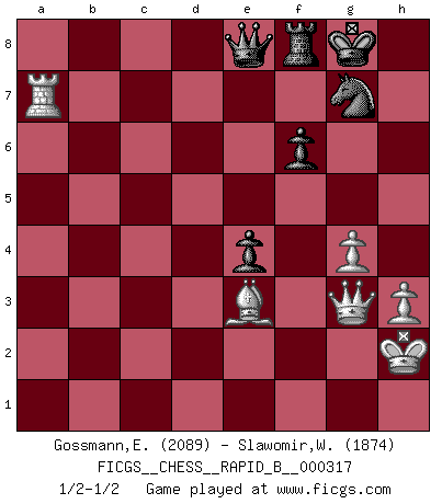 Last move : 1/2-1/2 2019 May 28 15:36:53 [Event "FICGS__CHESS__RAPID_B__000317"] [Site "FICGS"] [Date "2019.04.08"] [Round "1"] [White "Gossmann,Ewald"] [Black "Slawomir,Weglicki"] [Result "1/2-1/2"] [WhiteElo "2089"] [BlackElo "1874"] 1.e4 c5 2.Nf3 e6 3.d4 cxd4 4.Nxd4 a6 5.Bd3 b5 6.a4 bxa4 7.O-O d6 8.Nc3 Nd7 9.Rxa4 Nc5 10.Bb5+ Bd7 11.Bxd7+ Qxd7 12.Rc4 Nf6 13.Qe2 Be7 14.b4 Nb7 15.Nc6 O-O 16.Bb2 Rfc8 17.Nxe7+ Qxe7 18.Rxc8+ Rxc8 19.Qxa6 h6 20.b5 Ng4 21.h3 Ne5 22.Rb1 Kh7 23.Qa7 Qd7 24.Qe3 Qd8 25.Qg3 Qb6 26.Ba1 Rc4 27.Kh2 Nc5 28.Qe3 Ned7 29.Rd1 Qa5 30.f3 Qc7 31.Kh1 Qa5 32.Qd2 f6 33.Kh2 Qb4 34.f4 Qa5 35.Qe3 e5 36.f5 Qa3 37.Qg3 Nf8 38.Qe1 Na4 39.Rd3 Qb4 40.Qe3 Qa5 41.Nxa4 Qxa4 42.Bc3 Qxb5 43.Rxd6 Rc8 44.Be1 Qb8 45.Rd2 Qb1 46.Qe2 Qa1 47.c4 Qa6 48.Rc2 Nd7 49.Bf2 Nc5 50.Rd2 Nb3 51.Rd7 Qc6 52.Re7 Kh8 53.Qg4 Rg8 54.Be3 Qd6 55.Rf7 Nd2 56.Qe2 Nxe4 57.Bxh6 Ng3 58.Qf2 Nh5 59.Be3 e4 60.g3 Rb8 61.c5 Qd5 62.Ra7 Rb3 63.c6 Qxc6 64.Qe2 Qe8 65.Ra5 Kh7 66.Ra2 Rb5 67.Qg4 Rb7 68.Re2 g5 69.fxg6+ Qxg6 70.Qh4 Kg8 71.g4 Ng7 72.Ra2 Rb8 73.Qg3 Rf8 74.Ra7 Qe8 1/2-1/2 Sicilian : Kan, 5.Bd3 Kingside Castling by player White (move 7) Kingside Castling by player Black (move 15) This chess game ended in a draw. Follow this game move after move (download)When I asked Fischer why he had not played a certain move in our game, he replied: 'Well, you laughed when I wrote it down !' (Mikhail Tal) Im Leben werden Partien nie so unstrittig gewonnen wie im Spiel (Emanuel Lasker) El Ajedrez es un terrible juego. Si no controlas el centro, tu oponente tiene una posición mas holgada. Si tienes control del centro, ¡entonces realmente tu tienes algo de que preocuparte!. (Siegbert Tarrasch) L'action d'une oeuvre littéraire se déroule sur un champ de bataille. Les masques et les types du drame moderne correspondent aux pièces du jeu d'échecs. L'intrigue correspond aux coups et aux gambits, c'est à dire aux techniques du jeu telles qu'utilisées et interprétées par les joueurs. Les tactiques et les péripéties [mouvements] correspondent aux coups exécutés par l'adversaire. (Viktor Shklovsky) Somewhere in the world there is an epigram for every dilemma. (Hendrik Willem van Loon)