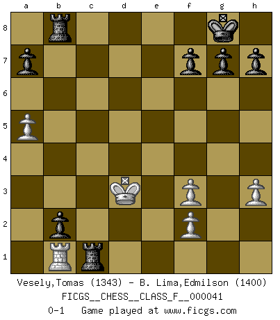 Last move : 0-1 2007 July 21 3:7:29 [Event "FICGS__CHESS__CLASS_F__000041"] [Site "FICGS"] [Date "2007.06.09"] [Round "1"] [White "Vesely,Tomas"] [Black "B. Lima,Edmilson"] [Result "0-1"] [WhiteElo "1343"] [BlackElo "1400"] 1.e4 e5 2.Nf3 Nf6 3.Nc3 Nc6 4.a3 d6 5.Bc4 Bg4 6.Bb5 Be7 7.h3 Bh5 8.d3 O-O 9.Nd5 Nxd5 10.exd5 Bxf3 11.gxf3 Nd4 12.a4 c6 13.dxc6 bxc6 14.Ba6 Qa5+ 15.c3 Qxa6 16.cxd4 exd4 17.b4 d5 18.O-O Bxb4 19.Ba3 c5 20.Bxb4 cxb4 21.Qb3 Rab8 22.Qxd5 Qxd3 23.Rfd1 Qg6+ 24.Kf1 Rfd8 25.Qe4 Qd6 26.Rxd4 Qxd4 27.Qxd4 Rxd4 28.a5 b3 29.Rb1 b2 30.Ke2 Rc4 31.Kd3 Rc1 0-1 Petrov Three knights game Kingside Castling by player Black (move 8) Kingside Castling by player White (move 18) Player Black won this chess game. Follow this game move after move (download)When the Chess game is over, the Pawn and the King go back to the same box. (Irish saying) Frage: Gibt es etwas was Sie mehr lieben als Autobahnen ohne Tempobegrenzungen? - Antwort: Deutsche Frauen ohne Tempobegrenzungen. (Loek van Wely) El muchacho (en ese entonces un niño de 12 años llamado Anatoly Karpov) no tiene ni idea de lo que es el Ajedrez y no hay futuro en absoluto para el en esta profesión. (Mikhail Botvinnik) Plusieurs personnes se sont demandées comment Tal faisait pour gagner... En fait, c'est très simple ! Il met ses pièces au centre de l'échiquier et les sacrifie quelque part ! (David Bronstein) Work expands to fill the time available. (C. Northcote Parkinson, in Parkinson's Laws)