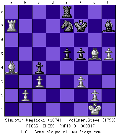 Last move : 1-0 2019 April 12 23:30:55 [Event "FICGS__CHESS__RAPID_B__000317"] [Site "FICGS"] [Date "2019.04.08"] [Round "1"] [White "Slawomir,Weglicki"] [Black "Vollmer,Steve"] [Result "1-0"] [WhiteElo "1874"] [BlackElo "1793"] 1.e4 e5 2.Nf3 Nc6 3.Bb5 a6 4.Ba4 d6 5.c3 Nf6 6.Qe2 Be7 7.O-O O-O 8.Rd1 Bg4 9.d3 b5 10.Bc2 h6 11.h3 Bh5 12.Nbd2 Qd7 13.Nf1 Rfe8 14.Ng3 Bg6 15.Nh4 Bh7 16.Nhf5 Bf8 17.Qf3 Ne7 18.Nxh6+ gxh6 19.Qxf6 Bg7 20.Nh5 Bxf6 21.Nxf6+ Kg7 22.Nxd7 Rad8 23.Nf6 Kxf6 24.Bxh6 c5 25.h4 d5 26.h5 c4 27.f3 Ke6 28.a4 f5 29.axb5 axb5 30.exd5+ Rxd5 31.Ra6+ Kf7 32.Bg5 Ng8 33.Ra7+ Ne7 34.dxc4 Rxd1+ 35.Bxd1 bxc4 36.Ba4 1-0 Ruy Lopez : Modern Steinitz defense Kingside Castling by player White (move 7) Kingside Castling by player Black (move 7) Player White won this chess game. Follow this game move after move (download)If cunning alone were needed to excel, women would be the best Chess players. (Albin) Ich hatte Angst gegen einen russischen Großmeister zu verlieren, und er befürchtete gegen einen kleinen Jungen zu verlieren. (über ein Remis gegen Juri Awerbach). (Robert James Fischer) El Ajedrez es realmente noventa y nueve por ciento calculación. (Soltis) Assurément je connaissais par expérience le mystérieux attrait de ce jeu royal, le seul entre tous les jeux inventés par les hommes qui échappe souverainement à la tyrannie du hasard, le seul où l'on ne doive sa victoire qu'à son intelligence ou plutôt à une certaine forme d'intelligence. Mais n'est-ce pas déjà le limiter injurieusement que d'appeler les échecs un jeu ? N'est-ce pas une science, un art ou quelque chose qui, comme le cercueil de Mahomet entre ciel et terre, est suspendu entre l'un et l'autre, et qui réunit un nombre incroyable de contraires ? [...] C'est une pensée qui ne mène à rien, une mathématique qui n'établit rien, un art qui ne laisse pas d'uvre, une architecture sans matière; et il l'a prouvé néanmoins qu'il était plus durable, à sa manière, que les livres ou que tout autre monument, ce jeu unique qui appartient à tous les peuples et à tous les temps, et dont personne ne sait quel dieu en fit don à la terre pour tuer l'ennui, pour aiguiser l'esprit et stimuler l'âme. Où commence-t-il, où finit-il ? (Stefan Zweig) Good luck. You're gonna need it. (Han Solo in Star Wars ep.6)