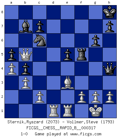 Last move : 1-0 2019 May 22 1:2:3 [Event "FICGS__CHESS__RAPID_B__000317"] [Site "FICGS"] [Date "2019.04.08"] [Round "1"] [White "Sternik,Ryszard"] [Black "Vollmer,Steve"] [Result "1-0"] [WhiteElo "2073"] [BlackElo "1793"] 1.e4 e5 2.Nf3 Nc6 3.Bb5 a6 4.Ba4 Nf6 5.O-O b5 6.Bb3 Be7 7.d4 Nxe4 8.dxe5 O-O 9.Bd5 Nc5 10.Nc3 Ne6 11.a4 b4 12.Ne4 a5 13.Re1 Rb8 14.Qd3 Bb7 15.b3 d6 16.Bxe6 fxe6 17.Neg5 Bxg5 18.Nxg5 g6 19.Nxe6 Qh4 20.Nxf8 Rxf8 21.Qd5+ Kh8 22.Be3 dxe5 23.Rad1 Rf5 24.Qb5 1-0 Ruy Lopez : 5.O-O Kingside Castling by player White (move 5) Kingside Castling by player Black (move 8) Player White won this chess game. Follow this game move after move (download)When I have White, I win because I am white; When I have Black, I win because I am Bogolyubov. (Bogolyubov) Der Traum, für den ich lebe, ist der von einem freien Russland. Viele mögen sagen: Russland hat doch ein Parlament, einen gewählten Präsidenten. Aber ich spüre, dass in meiner Heimat die Angst wiederkehrt. Eine Angst, sich frei zu äußern, bestimmte Dinge zu tun (Garry Kasparov) En el Ajedrez, tal como en la vida, las bendiciones de hoy pueden ser el veneno del mañana. (Assaic) 'L'échange des dames est un coup dur pour les deux adversaires...' Un journaliste lors d'une partie du match Spassky-Fischer Who needs drugs and alcohol if he can play Big Chess at FICGS ? (Heinz-Georg Lehnhoff)
