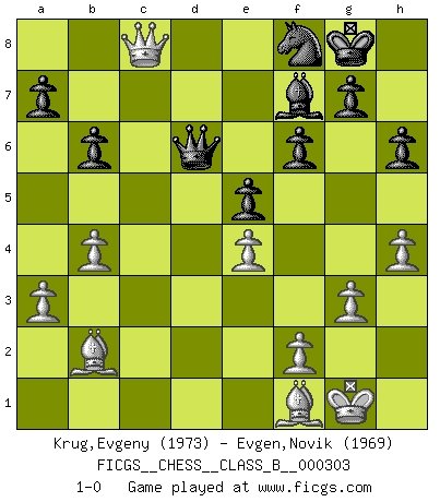 Last move : 1-0 2019 August 8 14:52:33 [Event "FICGS__CHESS__CLASS_B__000303"] [Site "FICGS"] [Date "2019.04.08"] [Round "1"] [White "Krug,Evgeny"] [Black "Evgen,Novik"] [Result "1-0"] [WhiteElo "1973"] [BlackElo "1969"] 1.d4 d5 2.Nf3 Nf6 3.c4 e6 4.Nc3 Bb4 5.Bg5 dxc4 6.e4 c5 7.Bxc4 cxd4 8.Nxd4 Qa5 9.Bd2 Qc5 10.Bb5+ Bd7 11.Nb3 Qe7 12.Bd3 Bxc3 13.Bxc3 O-O 14.O-O Nc6 15.a3 Rfd8 16.Na5 b6 17.Nxc6 Bxc6 18.Qe2 Nd7 19.b4 Rac8 20.Rac1 Bb7 21.Bb2 e5 22.Rfd1 Rxc1 23.Rxc1 Nf8 24.Rd1 Bc8 25.g3 f6 26.h4 Be6 27.Ba6 Rxd1+ 28.Qxd1 Bf7 29.Qc2 h6 30.Qc8 Qd6 31.Bf1 1-0 Queen's pawn game Kingside Castling by player Black (move 13) Kingside Castling by player White (move 14) Player White won this chess game. Follow this game move after move (download)No one ever won a game by resigning. (Unknown) Die FIDE ist dabei in die Hände der russischen Mafia zu fallen. (Larry Evans) Las ideas audaces son como las piezas del Ajedrez que avanzan hacia adelante. Ellas pueden ser vencidas, pero también pueden iniciar una partida victoriosa. (Goethe) Ce n'est pas pour s'amuser qu'il joue aux échecs : il célèbre un culte. (Vladimir Nabokov) I couldn't make any sense out of what this particular thread is about. It sounds like R2 D2 computer speaking. A space fight ?!? Some 'command' problems in Moscow ? Some killers & narcotic addicts attacking some game & a god wannabe ?? (Dinesh De Silva, lost in a russian conflict in FICGS forum)
