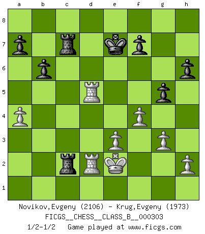 Last move : 1/2-1/2 2019 August 6 11:30:52 [Event "FICGS__CHESS__CLASS_B__000303"] [Site "FICGS"] [Date "2019.04.08"] [Round "1"] [White "Novikov,Evgeny"] [Black "Krug,Evgeny"] [Result "1/2-1/2"] [WhiteElo "2106"] [BlackElo "1973"] 1.d4 e6 2.Nf3 d5 3.c4 Nf6 4.Nc3 Be7 5.Bf4 O-O 6.e3 Nbd7 7.cxd5 Nxd5 8.Nxd5 exd5 9.a3 c5 10.dxc5 Nxc5 11.Be5 Bf5 12.Be2 Bf6 13.O-O Bxe5 14.Nxe5 Qf6 15.b4 Qxe5 16.bxc5 Rac8 17.Qd4 Rfe8 18.Bb5 Re7 19.Rfd1 Be4 20.Qxe5 Rxe5 21.Rac1 Rg5 22.g3 Rg6 23.Kf1 h6 24.Ke2 Rf6 25.Rd4 Kf8 26.a4 b6 27.c6 Ke7 28.f4 Rc7 29.Rcd1 g5 30.Bd3 Bxd3+ 31.R4xd3 Rfxc6 32.Rxd5 Rc2+ 33.R1d2 1/2-1/2 Queen's pawn Kingside Castling by player Black (move 5) Kingside Castling by player White (move 13) This chess game ended in a draw. Follow this game move after move (download)The way he plays Chess demonstrates a man's whole nature. (Stanley Ellin) Ich kenne Menschen, die allen Willen der Welt besitzen und doch nicht Schach spielen können. (Robert James Fischer) Mis oponentes también hacen buenas movidas. A veces yo no tomo esas cosas en consideración. (Bobby Fischer) Votre prénom est 'Tactique', votre deuxième prénom est 'Tactique' et votre nom est 'Tactique'. (Ken Smith) I teach you to lie, cheat and steal, and as soon as my back's turned you wait in line ? (Gregory House, House M.D.)